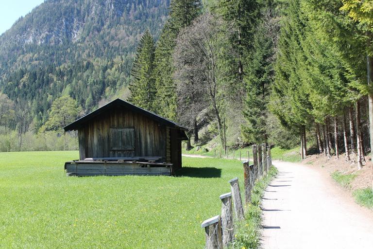 Keywords: alm meadow mountains landscape pasture alpine mountain meadow green nature bavaria panorama sky karwendel high mountains forest trees hut away sand