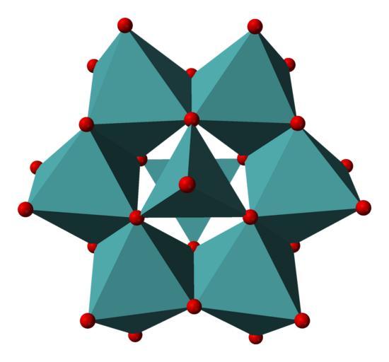 Keywords: Alpha-octamolybdate-from-xtal-3D-polyhedra-A.png Polyhedral model of the α-octamolybdate anion Mo<sub>6</sub>O<sub>26</sub><sup>4 ˆ’</sup> as found in the crystal structure of bis2 2'- butane-1 4-diyl bis 1H-benzimidazolium α-octamolybdate VI C<sub>18</sub>H<sub>20</sub>N<sub>4</sub> <sub>2</sub>α-Mo<sub>8</sub>O<sub>26</sub> X-ray crystallographic data from http //dx doi org/10 1107/S1600536807003017 Acta Cryst 2007 E63 m584-m586 Model constructed in http //www crystalmaker com/ CrystalMaker 8 1 Image generated in http //accelrys com/products/discovery-studio/visualization/discovery-studio-visualizer html Accelrys DS Visualizer Own 2008-03-14 Ben Mills Benjah-bmm27 Images by Ben Mills Alpha-octamolybdate ion |