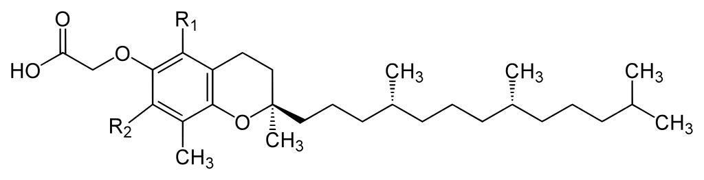 Keywords: Alpha TEA.svg en alpha TEA α-TEA; alpha-TEA; RRR-α-tocopherol ether-linked acetic acid; 2 5 7 8-tetramethyl-2R- 4R 8R 12-trimethyltridecyl chroman-6-yloxy acetic acid;<br> α R<sup>1</sup> R<sup>2</sup> CH<sub>3</sub>; β R<sup>1</sup> CH<sub>3</sub> R<sup>2</sup> H; γ R<sup>1</sup> H R<sup>2</sup> CH<sub>3</sub>; δ R<sup>1</sup> R<sup>2</sup> H de äh siehe oben Own Yikrazuul 2008-11-14 Vitamin E |