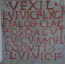 Keywords: Altair dedicated to Jupiter and Hercules Saxanus dedicated by Marcus Julius Cossutius (fragment).jpeg la I ovi O ptimo M aximo E t HER culi SAX ano VEXIL arii L egionis VI VIC tricis P iae F idelis L egionis X G eminae P iae F idelis ET AL arum COH ortium CLA ssis G ermanicae P iae F idelis Q ui S ub Q uinto ACVT io SV nt CV ra M arci IVL ii COSSVTI > centurionis L egionis VI VI tricis P iae F idelis de Weihaltar des Marcus Julius Cossutius für Juppiter und Hercules Saxanus aus dem Brohtal Fragment Bonn Rheinisches Landesmuseum Kopie in Saalburg Hessen Datierung nach den aufgeführten Legionen 101/102 n Chr pl Ołtarz poświęcony Jowiszowi i Herkulesowi Saxanus z doliny Brohlbachu Fragment Bonn Rheinisches Landesmuseum Kopia w Saalburgu Datowanie według wymienionych legionów ok roku 101/102 NE 2015-08-23 own A photography taken in Saalburg Saper other versions cc-zero Uploaded with UploadWizard Ancient Roman inscriptions in Bonn |