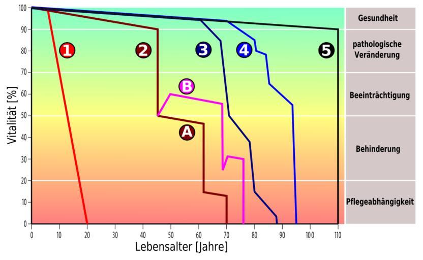 Keywords: Alternsverlaeufe 01.svg Typische Alternsverläufe <br /> 1 Alterungsprozess bei Progerie vorzeitige Vergreisung <br /> 2 Beschleunigte Alterung durch Risikofaktoren wie Bluthochdruck Nikotin u ä <br /> 2A Ohne therapeutische Maßnahmen <br /> 2B Im Fall einer therapeutischen Maßnahme nach einem Akutereignis beispielsweise eines Schlaganfalls kann eine Besserung der Vitalität und der Lebenserwartung erzielt werden <br /> 3 Eine schnelle Funktionsbeeinträchtigung mit einer langen Phase von Behinderung und Pflegeabhängigkeit wie sie im Fall von Demenz typisch ist <br /> 4 Ein Beispiel für žnormales Altern mit nur geringen Beeinträchtigungen auch in hohem Alter <br /> 5 Ein idealtypischer Alternsverlauf<br /> Daten Source von R F Schmidt F Lang und G Thews Physiologie des Menschen Verlag Springer 2005 ISBN 3-540-21882-3 2005 Seite 945 own inspired by Source 2010-08-12 Kuebi Armin Kübelbeck Gerontology |