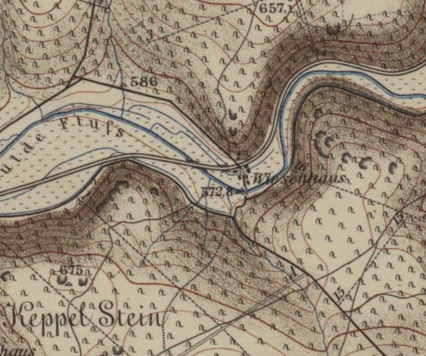 Keywords: Altes Wiesenhaus Zwickauer Mulde unterhalb von Wilzschhaus Blatt 145 Äquidistantenkarte Sachsen von 1876.jpg Altes Wiesenhaus auch Alt-Wiesenhaus genannt an der Zwickauer Mulde Ausschnitt aus Kartenblatt 145 “ Section Eibenstock “ der sächsischen Äqidistantenkarte von 1875 In der Karte ist der Verlauf der 1875 eröffneten Bahnlinie Bahnstrecke Chemnitz “Adorf dargestellt In Alt-Wiesenhaus wird die Straße überquert noch im 21 Jahrhundert gibt es eine Bahnschranke und das Technikgebäude neben dem Gleis ist noch deutlich als Hochbau der Bahn aus der Zeit der Entstehung zu identifizieren In der Karte ist die Örtlichkeit als žWiesenhaus bezeichnet denselben Namen trägt in dieser Karte die im Tal der Wilzsch gelegene kleine Häusergruppe oberhalb von Wilzschhaus die später zur besseren Unterscheidung den Namen Neues Wiesenhaus erhielt <br>Der Berg žKeppel-Stein wird in späteren Karten als žKöppelstein bezeichnet und weiter muldeabwärts im Bereich einer Häufung von Felsen verortet Diese Felsen sind auf diesem Kartenausschnitt südlich der Mulde und östlich von Alt-Wiesenhaus eingezeichnet <br> Der als Sträßchen eingezeichnete Weg - mit einer Brücke über die Mulde in Alt-Wiesenhaus - ist im 21 Jahrhundert die Bundesstraße 283 http //www deutschefotothek de/documents/obj/70302464/df_dk_0001016 Link zur Karte in der Staats- und Universitätsbibliothek Dresden Scan of a map from 1875 Kingdom of Saxony 1875 Historical maps of the Zwickauer Mulde Historical maps of Altes Wiesenhaus PD-old-70-1923 |