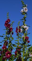 Keywords: althaea rosea hana aoi white pink red purple flowers bud leaf green otsu park yokosuka japan blue sky red tall