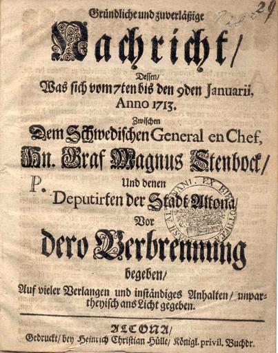 | Keywords: Altona.1713.1.jpg  Gruendliche und zuverläßige Nachricht Dessen/was sich Anno 1713 begeben/ à ber den Schwedenbrand in Altona 1713 Ex Bibliotheca Gymnasii Altonani circa 1714 undatierter Nachdruck eines 1713 erschienen Drucks unknown; printed by Huelle Altona PD-Old Schwedenbrand Altona 1713 |