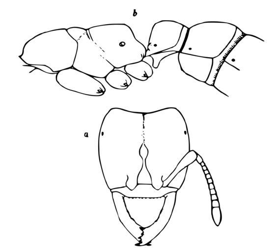 Keywords: Amblyopone.aberrans.-.wheeler.svg Amblyopone aberrans worker from West Australia a head dorsal view; b thorax petiole and postpetiole in profile Wheeler 1927 Ants of the genus Amblyopone Erichson Proc Am Acad Arts Sci 62 1-29 http //research amnh org/entomology/social_insects/ants/publications/3386/3386 pdf PDF 1927 W M Wheeler pd-old PD-old Drawings of animals by William Morton Wheeler Drawings of ants Amblyopone aberrans |