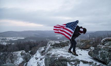 Keywords: american flag holding mountain top flag american usa states united stripes patriotic man male country standing patriotism
