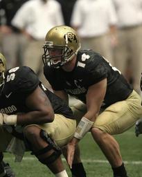 Keywords: american football quarterback calling signals sport competition helmet team college game player back concentration focus grass male person uniform football action football game center lineman activity