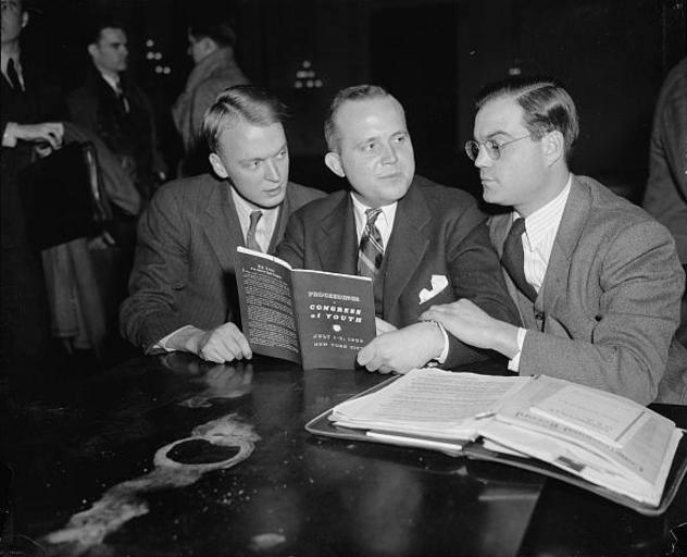 Keywords: American Youth Congress Leaders 1939.jpg en Representatives of American Youth Congress testify at Dies hearing Washington D C Nov 30 1939 Three members of the American Youth Congress left to right Jack R McMichael Chairman of the Congress; William W Hinckley former Chairman; and Joseph Cadden Executive Secretary testified before the Dies Committee that their organization had not been 'penetrated by communists ' Hinckley revealed that his organization was conducting a nationwide campaign to petition Speaker Bankhead to discontinue the Dies Committee Rep Joe Starnes acting Chairman of the Dies Subcommittee told the witnesses that neither he nor his committee cared what the witnesses thought of the committee--that he only wanted to hear statements founded on fact http //hdl loc gov/loc pnp/hec 27737 Harris and Ewing 1939-11-30 PD-Harris-Ewing Files by User Cuppysfriend 1939 in Washington D C Committees of the United States House of Representatives |
