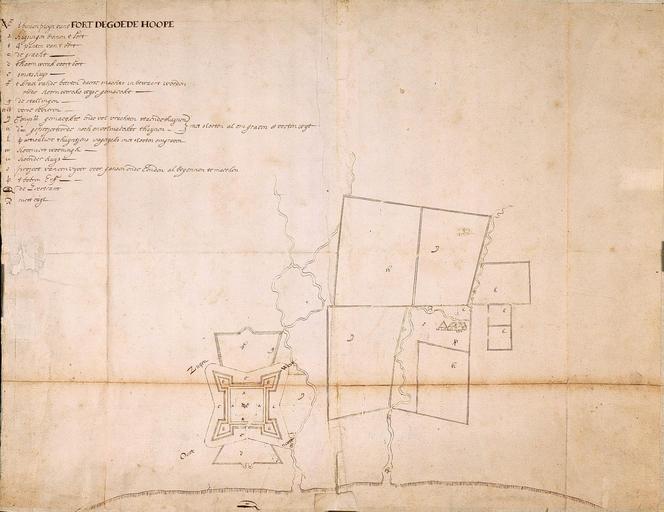 Keywords: AMH-2543-NA Map of the Fort of Good Hope.jpg Artwork nl Plattegrond van fort de Goede Hoop nl Titel catalogus Leupe NA Plan van fort de Goede Hoop met het daarvoor gelegen Hoornwerk en bygelegen gebouwen tuinen enz Kaart van het fort de landerijen en gebouwen in omgeving van Kaap de Goede Hoop Notities verso 1654 van de Kaap II deel nrs 203; 498 d Potlood Gedrukt Catal Leupe 816 Legenda a-r en According to the Leupe catalogue NA the original title reads Plan van fort de Goede Hoop met het daarvoor gelegen Hoornwerk en bygelegen gebouwen tuinen enz Map of the fort the surrounding estates and buildings of the Cape of Good Hope Notes on reverse 1654 van de Kaap II deel nrs 203; 498 d Potlood Gedrukt Catal Leupe 816 Key a-r Atlas of Mutual Heritage na http //www atlasofmutualheritage nl/en/object/ id 2543 Source at the Atlas of Mutual Heritage - http //www gahetna nl/collectie/archief/inventaris/index/eadid/4 VEL/inventarisnr/816/level/file Source at the Nationaal Archief en Subjects chart / map / plan fortification building estate / plantation garden / ornamental garden key nl Onderwerpen plattegrond / kaart vesting gebouw landerij / plantage tuin / siertuin legenda en Fort this image is related to a VOC fort called http //www atlasofmutualheritage nl/en/fort/ id 15 kasteel de Goede Hoop Inscription 't binnen pleijn vant Fort de Goede Hoope nl circa 1654 nl Anoniem / Anonymous en Anoniem / Anonymous Institution Nationaal Archief nl pen op papier en pen on paper Size mm 420 530 accession number NL-HaNA_4 VEL_816 old number VEL0816 PD-Art-100 Maps of the Dutch East India Company - South Africa 1654 maps Castle of Good Hope