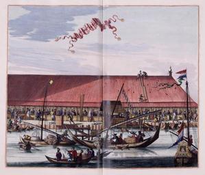 Keywords: AMH-4771-KB The Batavia fishmarket.jpg Artwork nl De Vismarkt van Batavia nl Gezicht op de Vismarkt van Batavia Op de voorgrond enkele platte vissersschepen en vismanden in het water Enkele mannen zijn met behulp van ladders op het dak geklommen Cf Westfries Museum inv nr 15241 02 De prent uit de Atlas Van Stolk inv nr top1039 en Koninklijke Bibliotheek inv nr 388 A 9 deel II na p 206 is zwart-wit de prent uit de Koninklijke Bibliotheek Atlas van der Hagen Koninklijke Bibliotheek Den Haag Deel 4 inv nr 1049B13_28 is ingekleurd en View of the fishmarket at Batavia In the foreground several flat-bottomed fishing vessels and baskets in the water Several men have climbed ladders leading to the roof Cf Westfries Museum inv nr 15241 02 The print in the Atlas Van Stolk inv nr top1039 and Koninklijke Bibliotheek inv nr 388 A 9 part II afer p 206 is in black and white while the print from the Koninklijke Bibliotheek Atlas van der Hagen Koninklijke Bibliotheek The Hague Part 4 inv nr 1049B13_28 has been coloured in Atlas of Mutual Heritage kb http //www atlasofmutualheritage nl/en/object/ id 4771 Source at the Atlas of Mutual Heritage en Subjects survey / view ship / vessel nl Onderwerpen overzicht / aanzicht schip / vaartuig en Post this image is related to a VOC trading post called http //www atlasofmutualheritage nl/en/post/ id 328 Jakarta Inscription Vismarkt op Batavia nl 1682 Creator Weduwe van Jacob van Meurs nl Anoniem / Anonymous graveur / etser Weduwe van Jacob van Meurs uitgever en Anoniem / Anonymous engraver / etcher Weduwe van Jacob van Meurs publisher Institution Koninklijke Bibliotheek nl koperdruk op papier en copperplate printing on paper Size cm 30 3 36 accession number 1049B13_028 PD-Art-100 Dutch East India Company 1682 |