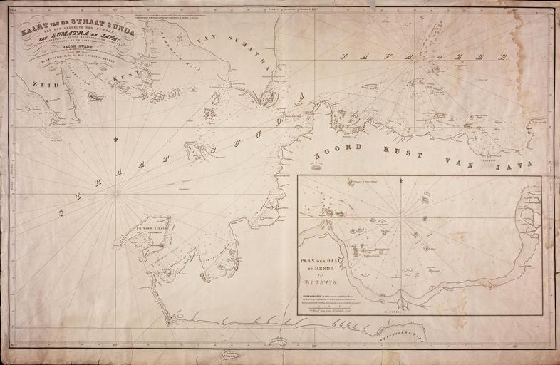 Keywords: AMH-5529-NA Map of the Soenda Straits and an insert showing the roadstead of Batavia.jpg Artwork nl Kaart van de Straat Soenda en een inzet van de rede van Batavia nl Titel catalogus Leupe NA Kaart van de Straat Sunda met een gedeelte der Kusten van Sumatra en Java enz Bijzonderheden uitgegeven in 1838 Notities verso No 5 / 245 a in potlood / Kast 1 en Title in the Leupe catalogue NA Kaart van de Straat Sunda met een gedeelte der Kusten van Sumatra en Java enz Particulars published in 1838 Notes on reverse No 5 / 245 a in pencil / Kast 1 Atlas of Mutual Heritage na http //www atlasofmutualheritage nl/en/object/ id 5529 Source at the Atlas of Mutual Heritage - http //www gahetna nl/collectie/archief/inventaris/index/eadid/4 VEL/inventarisnr/359/level/file Source at the Nationaal Archief en Subjects chart / map / plan banderole / cartouche / ornamentation nl Onderwerpen plattegrond / kaart banderol / cartouche / versiering en Post this image is related to a WIC trading post called http //www atlasofmutualheritage nl/en/post/ id 317 Banten Inscription Kaart van de Straat Sunda met een Gedeelte der Kusten van Sumatra en java; volgens aanwezige en eenige medegedeelde berigten ontworpen en te zamengesteld door Jacob Swart / Plan der Baai en Reede van Batavia author Te Amsterdam bij de Wed G Hulst van Keulen nl 1838 Creator Jacob Swart Creator Wed Gerard Hulst van Keulen nl Jacob Swart landmeter / kaartenmaker Wed Gerard Hulst van Keulen uitgever en Jacob Swart land surveyor / mapmaker Wed Gerard Hulst van Keulen publisher Institution Nationaal Archief nl koperdruk op papier en copperplate printing on paper Size cm 67 102 5 accession number NL-HaNA_4 VEL_359 old number VEL0359 PD-Art-100 Sunda Strait maps of West Java maps of Lampung Indonesia in the 1830s Old maps of Indonesia 1838 in Indonesia 1838 |