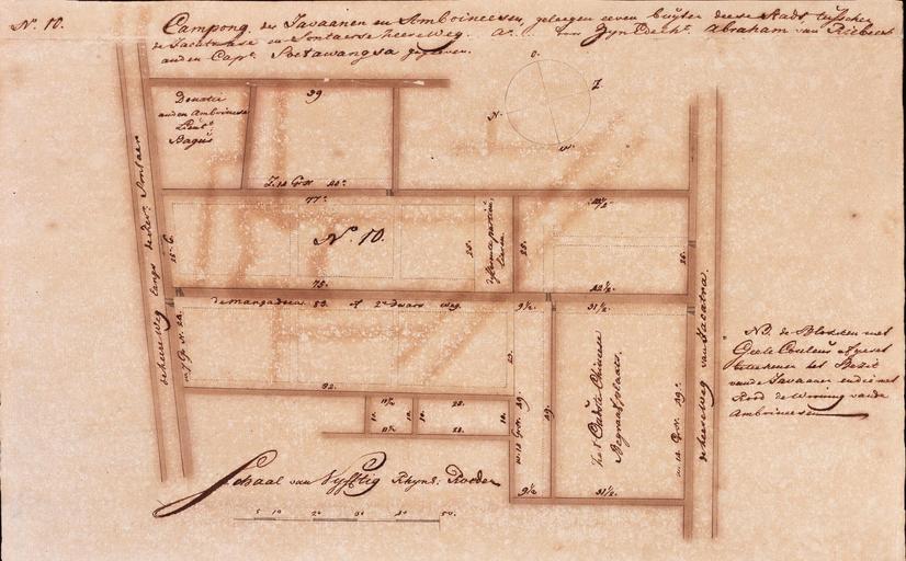 Keywords: AMH-6045-NA Map of farmlands in the Batavia area, part ten.jpg Artwork nl Kaart van landerijen in de omgeving van Batavia deel tien nl Titel catalogus Leupe NA Campong der Javaanen en Amboineesen geleegen eeven bijten desse stadt tuschen de Jacatrase en Sontaerse heerweg a door Z E Abraham van Riebeek an den capit Soetawanga gegeeven Het kaartje maakt deel uit van een verzameling van 24 kaartjes en is genummerd no 10 linksboven en in het midden N 10 De nummers 11 20 21 en 26 ontbreken Rechts de tekst NB de blokken met Geele Couleur afgeset beteekenen het bezit vande Javaanen en die met Rood de Woning van de Amboineesen Boven is een kompas Z;W;N;O en een schaalverdeling is onder Schaal van Vijftig Rhijns Roeden In het midden een plattegrond van wegen en grachten zoals de heereweg langs de Revr Sondaer de Mangadoea of 2de dwars weg Douatie anden Amboineese Lieut Bagus de heereweg van Jacatra het Oudste Chineese Begraafplaats en Title Leupe catalogue NA Campong der Javaanen en Amboineesen geleegen eeven bijten desse stadt tuschen de Jacatrase en Sontaerse heerweg a door Z E Abraham van Riebeek an den capit Soetawanga gegeeven The map is part of a collection of 24 charts and is numbered no 10 top left and in the centre N 10 The numbers 11 20 21 and 26 are missing To the right the following text NB de blokken met Geele Couleur afgeset beteekenen het bezit vande Javaanen en die met Rood de Woning van de Amboineesen Top is a compass Z;W;N;O and a scale Schaal van Vijftig Rhijns Roeden In the centre a map of roads and canals comprising de heereweg langs de Revr Sondaer de Mangadoea of 2de dwars weg Douatie anden Amboineese Lieut Bagus de heereweg van Jacatra het Oudste Chineese Begraafplaats Atlas of Mutual Heritage na http //www atlasofmutualheritage nl/en/object/ id 6045 Source at the Atlas of Mutual Heritage - http //www gahetna nl/collectie/archief/inventaris/index/eadid/4 VELH/inventarisnr/452 10/level/file Source at the Nationaal Archief en Subjects chart / map / plan estate / plantation compass / dial cemetery / graveyard bridge nl Onderwerpen plattegrond / kaart landerij / plantage kompas / windroos begraafplaats / kerkhof brug en Fort this image is related to a VOC fort called http //www atlasofmutualheritage nl/en/fort/ id 46 fort Jacatra Inscription Campong der Javaanen en Amboineesen geleeven eeven buijten desse Stadt tusschen de Jacatrase en Sontaerse heere Weg A door Zyn Edelht Abraham van Riebeek anden Capt Soetawangsa gegeeven nl between 1689 1709 nl Anoniem / Anonymous en Anoniem / Anonymous Institution Nationaal Archief nl pen en penseel op papier en pen and brush on paper Size cm 27 42 5 accession number NL-HaNA_4 VELH_452 10 old number VELH0452_10 PD-Art-100 Indonesia in the 17th century Maps of the Dutch East India Company - Indonesia Batavia |