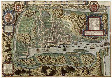 Keywords: AMH-6577-KB Bird's eye view of the city of Goa.jpg Artwork nl Plattegrond in vogelvlucht van de stad Goa nl Plattegrond in vogelvlucht van de stad Goa A Ilhae cidade de Goa metropolitana da Indiae partes orientais que esta en 15 graos da banda do norte Er liggen enkele Portugese Oost-Indiëvaarders voor de kust Op de kade zijn olifanten bereden door mensen te zien Midden in de haven ligt een kleine omgeslagen sloep met twee mensen die er half op liggen Goa Indiae Orientalis Metropolis Emprij longe dtis pro rege Archi-episcop supremo Senalo cupletis exacta descriptio Auctor Iohannes Hugonius A linschoten 1595 Affconterfeytinge van princepaele Coop en hooft Stat des Rycks Goa alwaer die Aertsbischop Viceroy en oppersten Raet van Portugaels Indijen Resideert door Ian Huijge van Linschoten A o 1595 Verclaeringe van sommige Portugeesche woorden vande vornaemste plaetsen vande stat en t' eylant Goa Benesteri ou paßo de satiago / Benes tery ofte de paßagie van S Iacop Paßo seco / De drooge paßagie Paß de daugi / Paßagie van daugij Paßo de Norua / Paßagie van Norua Paßde Pangi / Paßagie van Pangijn Goa velha / Out Goa Cazas do Vizorey / De Huysingen van Vizeroy Cazas do Arcebispo / De Huysinge van Aertsbischop A Camara / Stat Huys Os Contos / Des Conincx Reekenkamer Alfandegea / Tolhuys O Pezo / De Waech Asouge / De Hal Tronco / t' Gevangenhuys O Terrereiro / t' Coornhuys A Moeda / De Munte Banganin / De fonteyn alsoo genaemt Pannelin / t' Speelhuys ofte lusthoff van Aertsbischop Pilourinho velho e novo / d'Oude en nieuwe Caecke Bazar grande / d' Groote vismerckt Bangasal / De plaets daermen t'barnhout vercoopt Vazar o de S Fran co / De cleyne merckt van S Fran co Ribeira das gales / De timmerwerven van galleijen Ribeira grande / De groote Conincx timmerwerven Cava / Dat zijn de oude grach van eerste stat geweest Alagoa / t Lack Leilao / Den wijtrop ofte daer men de daegelickse boerse hout Vargeas de batte / De ackerwerven van Rys A surgideira das naos do Reyno / De reede van Portugaelsche scheepen Costa brava da Ylha de Goa / De rudsige custe vant Eylant Goa Praya de Bardes de Marem fora / De strant van Bardes aen over van Zee Champanas e cotias dos gentios / De Champanen en Cottrijen van heydenen Alwaer terreiro oft terr o staet is een plaets gseyt en datter by staet is den naem van plaets Hetruscis urbem tectis quce certet et uno Spectare intuitu vis Orientis opes Imos Goa licet nostro semotior orbe Una tibi sensus expleat atque oculos Seu fora se spectes plateas seu templa Deor Obuia maiestas par et ubique nitor Aspice quam prono subductae littore puppes Quamque iter emensae fida rati statio Haud alia emporio locupletior Indus Eoi Ditia quam late dividit arva soli PHoogerbeets monogram Serniss o Principi Alberto ab Astria sacro sanctae Apost ce se dis Card Tit Sanctae Crucis in Ieusalem et Legato per Hispanias ala tere Lusitaniae et Algerbiorum pro-regi Hispaniae que Catho Ma tis nomine gubernatori Archiduci Austriae duci Burgundiae comiti Tyrolis etcr Dno suo clementis simo Iohannis Hugonius a Lynsco ten humillime dedic Inclyte avis Princeps prudenti a pectore maior Obsequy patere hoc symbolo esse mei Cf Koninklijke Bibliotheek inv nr 189 A 6 deel I voor p 71 en Bird's eye view of the city of Goa A Ilhae cidade de Goa metropolitana da Indiae partes orientais que esta en 15 graos da banda do norte There are several Portuguese East Indiamen lying off the coast People astride elephants are depicted on the quay In the centre of the harbour is a capsized sloop with two people clinging on Goa Indiae Orientalis Metropolis Emprij longe dtis pro rege Archi-episcop supremo Senalo cupletis exacta descriptio Auctor Iohannes Hugonius A linschoten 1595 Affconterfeytinge van princepaele Coop en hooft Stat des Rycks Goa alwaer die Aertsbischop Viceroy en oppersten Raet van Portugaels Indijen Resideert door Ian Huijge van Linschoten A o 1595 Verclaeringe van sommige Portugeesche woorden vande vornaemste plaetsen vande stat en t' eylant Goa Benesteri ou paßo de satiago / Benes tery ofte de paßagie van S Iacop Paßo seco / De drooge paßagie Paß de daugi / Paßagie van daugij Paßo de Norua / Paßagie van Norua Paßde Pangi / Paßagie van Pangijn Goa velha / Out Goa Cazas do Vizorey / De Huysingen van Vizeroy Cazas do Arcebispo / De Huysinge van Aertsbischop A Camara / Stat Huys Os Contos / Des Conincx Reekenkamer Alfandegea / Tolhuys O Pezo / De Waech Asouge / De Hal Tronco / t' Gevangenhuys O Terrereiro / t' Coornhuys A Moeda / De Munte Banganin / De fonteyn alsoo genaemt Pannelin / t' Speelhuys ofte lusthoff van Aertsbischop Pilourinho velho e novo / d'Oude en nieuwe Caecke Bazar grande / d' Groote vismerckt Bangasal / De plaets daermen t'barnhout vercoopt Vazar o de S Fran co / De cleyne merckt van S Fran co Ribeira das gales / De timmerwerven van galleijen Ribeira grande / De groote Conincx timmerwerven Cava / Dat zijn de oude grach van eerste stat geweest Alagoa / t Lack Leilao / Den wijtrop ofte daer men de daegelickse boerse hout Vargeas de batte / De ackerwerven van Rys A surgideira das naos do Reyno / De reede van Portugaelsche scheepen Costa brava da Ylha de Goa / De rudsige custe vant Eylant Goa Praya de Bardes de Marem fora / De strant van Bardes aen over van Zee Champanas e cotias dos gentios / De Champanen en Cottrijen van heydenen Alwaer terreiro oft terr o staet is een plaets gseyt en datter by staet is den naem van plaets Hetruscis urbem tectis quce certet et uno Spectare intuitu vis Orientis opes Imos Goa licet nostro semotior orbe Una tibi sensus expleat atque oculos Seu fora se spectes plateas seu templa Deor Obuia maiestas par et ubique nitor Aspice quam prono subductae littore puppes Quamque iter emensae fida rati statio Haud alia emporio locupletior Indus Eoi Ditia quam late dividit arva soli PHoogerbeets monogram Serniss o Principi Alberto ab Astria sacro sanctae Apost ce se dis Card Tit Sanctae Crucis in Ieusalem et Legato per Hispanias ala tere Lusitaniae et A