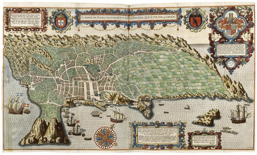 | Keywords: AMH-6602-KB Bird's eye view of the city of Angra on Tercera, the Azores.jpg Artwork nl Vogelvlucht van de stad Angra op Tercera Azoren nl Gezicht op de stad Angra op Tercera A cidade de Angra na Ilha de Iesu xpoda Tercera que esta em 39 Graos Illustri et generoso Dno Christophoro a Moura Viro inter cubiculi regii proceres primario regnique ordinum Consiliario rerum Lusitanicarum administratori Vigilantissimo Alcantarae Commendatori et Insularum Tercerae et scti Georgii Praefecto dignissimo Dno suo Multis Nominibus colendo Ioannes Hugonius a Linscoten observantissimè dedicabat Angrae Urbis Tercerae que insularum quas Azores vocant maxima copioso glasti proventu ditiß a accurata cum are delineatio Hanc ob Episcopi praefecti et regij senatus auctoritates aliae tanque supremam respiciunt Auctor Ioannes Hugonius a linschoten a o 1595 / Affbeeldinge vande Stat Angra met het slot op het Eylant Tercera welcke alle de eylanden onderworpen zijn diemen Azores ofte de Vlaemsche Eylanden noemt door de residentije des Bischops en des Conincks Governeur en Raet aldaer zynde Tercera wel de grootste en ryckste van allen door het gewas en verhandelinge van het Pastel door Jan Huygen van Linschoten a o 1595 Uda mari saxo stabilis ditißima glasto Fruges ferre bonas non renuente solo Maxima vicinas inter Tercera profundi Hac specie occiduis eminet alta vadis P hoogerb Het schip uiterst links vuurt een schot af Cf Universiteitsbibliotheek Universiteit van Amsterdam inv nr OF 63 771 na p 248 en Nationaal Archief Den Haag inv nr VELH 619 106 en View of the city of Angra on Tercera A cidade de Angra na Ilha de Iesu xpoda Tercera que esta em 39 Graos Illustri et generoso Dno Christophoro a Moura Viro inter cubiculi regii proceres primario regnique ordinum Consiliario rerum Lusitanicarum administratori Vigilantissimo Alcantarae Commendatori et Insularum Tercerae et scti Georgii Praefecto dignissimo Dno suo Multis Nominibus colendo Ioannes Hugonius a Linscoten observantissimè dedicabat Angrae Urbis Tercerae que insularum quas Azores vocant maxima copioso glasti proventu ditiß a accurata cum are delineatio Hanc ob Episcopi praefecti et regij senatus auctoritates aliae tanque supremam respiciunt Auctor Ioannes Hugonius a linschoten a o 1595 / Affbeeldinge vande Stat Angra met het slot op het Eylant Tercera welcke alle de eylanden onderworpen zijn diemen Azores ofte de Vlaemsche Eylanden noemt door de residentije des Bischops en des Conincks Governeur en Raet aldaer zynde Tercera wel de grootste en ryckste van allen door het gewas en verhandelinge van het Pastel door Jan Huygen van Linschoten a o 1595 Uda mari saxo stabilis ditißima glasto Fruges ferre bonas non renuente solo Maxima vicinas inter Tercera profundi Hac specie occiduis eminet alta vadis P hoogerb The vessel extreme left is shown firing a shot Cf Universiteitsbibliotheek Universiteit van Amsterdam inv nr OF 63 771 after p 248 and Nationaal Archief Den Haag inv nr VELH 619 106 Atlas of Mutual Heritage kb http //www atlasofmutualheritage nl/en/object/ id 6602 Source at the Atlas of Mutual Heritage en Subjects fence / kraal banderole / cartouche / ornamentation anchorage / pier / harbour building compass / dial church / parsonage chart / map / plan ship / vessel bird's-eye view / elevation elevation / bird's-eye view fortification nl Onderwerpen omheining / kraal banderol / cartouche / versiering rede / haven / pier gebouw kompas / windroos kerk / pastorie plattegrond / kaart schip / vaartuig vogelvlucht / opstand opstand / vogelvlucht vesting Inscription A cidade de Angra na Ilha de Iesu xpoda Tercera que esta em 39 Graos author Baptista à Doetechum sculp nl circa 1596 Creator Jan Huygen van Linschoten Creator Joannes / Baptista à / van Doetechum Creator Cornelis Claesz Creator Pieter Hoogerbeets nl Jan Huygen van Linschoten gewerkt naar Joannes / Baptista à / van Doetechum graveur / etser Cornelis Claesz uitgever Pieter Hoogerbeets schrijver en Jan Huygen van Linschoten copied after Joannes / Baptista à / van Doetechum engraver / etcher Cornelis Claesz publisher Pieter Hoogerbeets writer Institution Koninklijke Bibliotheek nl ingekleurde gravure op papier en coloured engraving on paper Size cm 85 5 52 accession number 1702 B 4 deel I na p 150 PD-Art-100 1596 |