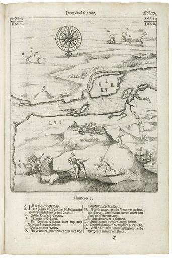 Keywords: AMH-8120-KB Bird's eye view of Leeuweneiland and Porto Desire.jpg Artwork nl Vogelvlucht van Leeuweneiland en Porto Desire nl Vogelvlucht van Leeuweneiland en Porto Desire Op de kaart zijn de legendanummers A t/m N gegeven met verklaring De reis van Schouten en Le Maire werd in 1615 uitgerust door de vader van Le Maire voor de Australische Compagnie Deze compagnie probeerde het octrooi van de VOC te omzeilen door een andere route naar Indonesiƫ te vinden Dit lukte Schouten en Le Maire door om Vuurland heen te zeilen in plaats van door de straat Magelaen Het mocht niet baten eenmaal in Batavia werden ze niet geloofd en het overgebleven schip de Eendracht werd met lading in beslag genomen Porto Desire ligt aan de Patagonische kust van Argentiniƫ De expeditie van Willem Schouten en Jacob le Maire wilde hier aan land om vers water en voedsel in te slaan Het noodlot sloeg echter toe bij onderhoud ging het jacht 'Hoorn' in vlammen op De brand is rechts op de afbeelding te zien Linksonder is te zien hoe de bemanning een zeeleeuw doodt om aan vlees te komen Cf Universiteitsbibliotheek Amsterdam inv nr OK 80 647 na p 49 en Bird's eye view of Leeuweneiland and Porto Desire The chart bears the numbers A through N of a key together with explanatory notes Van Schouten and Le Maire's journey was equipped by Le Maire's father in 1615 for the Australische Compagnie This company attempted to circumvent the VOC patent by finding an alternative route to Indonesia Schouten and Le Maire succeeded in their quest by sailing around Vuurland instead of through the Magellan Straits But it was all in vain for once in Batavia their story was not believed and their one remaining ship the Eendracht was confiscated along with its cargo Porto Desire is situated on Argentina's Patagonian coast The expedition of Willem Schouten and Jacob le Maire had intended to make landfall here to stock up with fresh water and provisions But fate intervened during repairs the vessel 'Hoorn' burst into flames The blaze is depicted on the right of the picture Bottom left the crew is shown killing a seal for its meat Cf Universiteitsbibliotheek Amsterdam inv nr OK 80 647 after p 49 Atlas of Mutual Heritage kb http //www atlasofmutualheritage nl/en/object/ id 8120 Source at the Atlas of Mutual Heritage en Subjects survey / view bird's-eye view / elevation elevation / bird's-eye view compass / dial key Person ship / vessel fauna nl Onderwerpen overzicht / aanzicht vogelvlucht / opstand opstand / vogelvlucht kompas / windroos legenda Persoon schip / vaartuig fauna 1622 Creator M Colijn nl M Colijn uitgever Anoniem / Anonymous graveur / etser en M Colijn publisher Anoniem / Anonymous engraver / etcher Institution Koninklijke Bibliotheek nl gravure op papier en engraving on paper Size cm 20 13 5 accession number 108 D 7 dl III fol 17 PD-Art-100 1622 Jacob le Maire Willem Schouten |