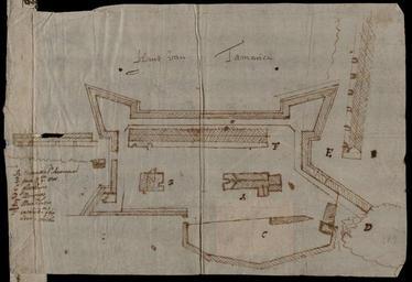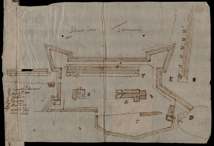 Keywords: AMH-8573-NA Floor plan of the Tamarica fort.jpg Artwork nl Plattegrond van het fort Tamarica nl Plattegrond van het fort Tamarica Titel in Catalogus Leupe NA Plan van het Kasteel Tamarica Plant van Tamarica Legenda A-F Rechtsonder in potlood n 87 en Floor plan of the Tamarica fort Title in the Leupe Catalogue NA Plan van het Kasteel Tamarica Plant van Tamarica Key A-F Bottom right in pencil n 87 Atlas of Mutual Heritage na http //www atlasofmutualheritage nl/en/object/ id 8573 Source at the Atlas of Mutual Heritage - http //www gahetna nl/collectie/archief/inventaris/index/eadid/4 VEL/inventarisnr/702/level/file Source at the Nationaal Archief en Subjects chart / map / plan key fortification building nl Onderwerpen plattegrond / kaart legenda vesting gebouw en Post this image is related to a WIC trading post called http //www atlasofmutualheritage nl/en/post/ id 1029 Itamaracà eiland Inscription Plant van Tamarica nl circa 1630 nl Anoniem / Anonymous landmeter / kaartenmaker en Anoniem / Anonymous land surveyor / mapmaker Institution Nationaal Archief nl pen op papier en pen on paper Size cm 22 30 accession number NL-HaNA_4 VEL_702 old number VEL0702 PD-Art-100 Maps of the West-Indische Compagnie 1630 |