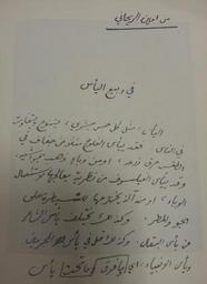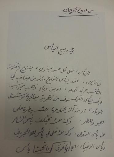 Keywords: Amīn Al-Rīḥānī Hand Writting.jpg ar كتابة بخط أمين الريحاني، جاء فيها، من الأعلى من أمين الريحاني في ربيع اليأس اليأس، مثل كُلِّ حسٍّ بشريٍّ، يتنوَّع ويتفاوت في الناس فقد ييأس الفلَّاح مثلًا من جفافٍ في الطقس حرق الزرع، أو من وباءٍ ذهب بمواشيه وقد ييأس الفيلسوف من نظريَّةٍ يُعالجها لاستئصال الوباء، أو من آلةٍ يخترعُها للسيطرة على الجو والمطر وكذلك يختلفُ يأس الشاعر عن يأس البقَّال، وكذلك قُل في يأس المُجرمين ويأس الأنبياء، أي ما فوق وما تحت يأس en A Hand writing by Amīn Al-Rīḥānī it says from top to bottom right to left From Amīn Al-Rīḥānī in the spring of Angst Desperation as any other human feeling is diverse and vast in different people A peasant for instance might feel desperate because of a dry weather that destroyed his crops or because of a disease that killed his livestock A philosopher meaning wise man here might get desperate because of some theory he is struggling to prove in order to eradicate that disease or trying to create a machine that allows him to control the weather and rain That been said A poet's Angst is different from that of a Grocer and that goes true also for criminals and prophets All who are at the top feel Angst and all those who are at the bottom before 1940 date of death Photographed by me from a book entitled أمين الريحاني رحَّالة العرب Amin Al-Rihani Rahhalat Al-'arab published in Lebanon in 1970 Amin Al-Rihani 1876 1940 Created this letter by his own hand Custom license marker 2014 09 03 PD-Lebanon PD-Old Uploaded with UploadWizard Ameen Rihani |
