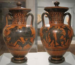 Keywords: Amphora with lid attributed to the Acheloos Painter, HAA.jpg en Amphora wine container with lid attributed to the Acheloos Painter Attic c 530 BCE black-figure terracotta Honolulu Academy of Arts own Hiart photo 2011 Cc-zero Acheloos Painter Attic black-figure pottery Ancient Greek Neck amphoras Ancient Greek pottery in the Honolulu Museum of Art 530s BC pottery Usa 6th-century BC pottery in the United States Amphoras with lid |