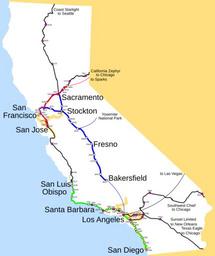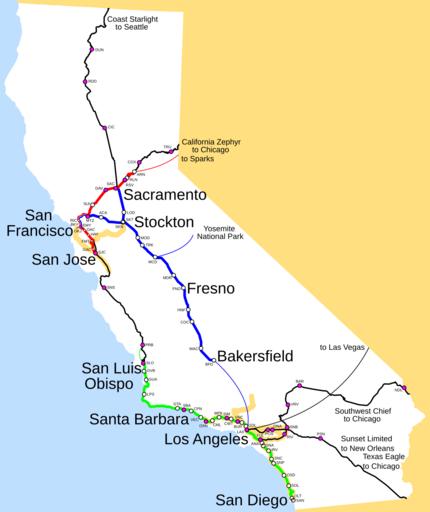 Keywords: Amtrak California map.svg Simplified version exists at Image Amtrak California simplified map svg Map of Amtrak routes in California highlighting the Amtrak California services Capitol Corridor red Pacific Surfliner green San Joaquins blue Other Amtrak routes daily or less are in black Stations served by those trains have a purple center Thin lines are Thruway Motorcoach bus connections Thick orangish lines are commuter rail Altamont Commuter Express Caltrain Metrolink and San Diego Coaster <gallery> File Amtrak California map svg </gallery> Amtrak maps Rail transport maps of California Public transport maps of California Amtrak California spuimap |