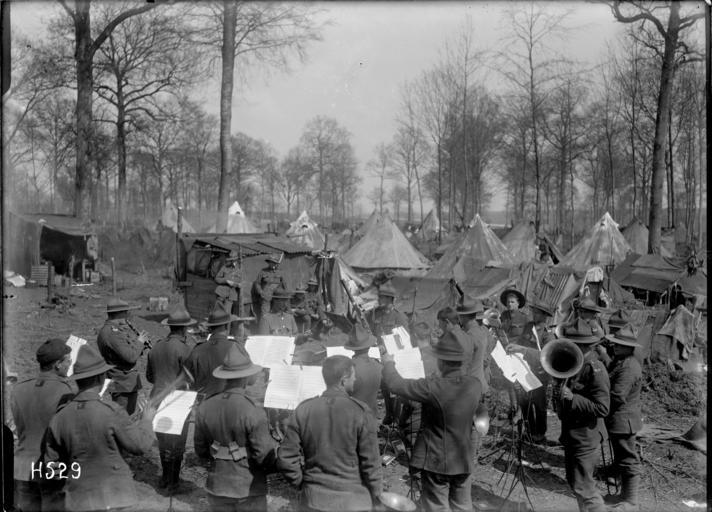 Keywords: the great war thegreatwar great war greatwar world war one worldwarone world war i worldwari wwi first world war firstworldwar new zealand expeditionary force newzealandexpeditionaryforce nzef military band militaryband tent tents blackandwhite monochrome people outdoor black and white An Otago Regimental Band performing in the transport lines under trees near Louvencourt, France during World War I. Photograph taken 20 April 1918 by Henry Armytage Sanders. Inscriptions: Inscribed - Photographer's title on negative -bottom left: H529. Quantity: 1 b&w original negative(s). Physical Description: Dry plate glass negative 4.75 x 6.5 inches An Otago Regimental Band performing at Louvencourt, World War I. Royal New Zealand Returned and Services' Association :New Zealand official negatives, World War 1914-1918. Ref: 1/2-013146-G. Alexander Turnbull Library, Wellington, New Zealand. natlib.govt.nz/records/22796948 An Otago Regimental Band performing in the transport lines under trees near Louvencourt, France during World War I. Photograph taken 20 April 1918 by Henry Armytage Sanders. Inscriptions: Inscribed - Photographer's title on negative -bottom left: H529. Quantity: 1 b&w original negative(s). Physical Description: Dry plate glass negative 4.75 x 6.5 inches An Otago Regimental Band performing at Louvencourt, World War I. Royal New Zealand Returned and Services' Association :New Zealand official negatives, World War 1914-1918. Ref: 1/2-013146-G. Alexander Turnbull Library, Wellington, New Zealand. natlib.govt.nz/records/22796948 |