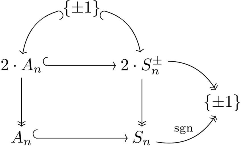 Keywords: An-Sn-covering-groups.svg Commutative diagram connecting the covering groups of the alternating and symmetric groups Own work by Nils R Barth 2009-11-17 Nils R Barth Released into the public domain by the author TeX source TeX source produced as detailed at meta Help Displaying a formula Commutative diagrams <source lang latex > \documentclass amsart \usepackageall ps xy Loading the XY-Pic package Using postscript driver for smoother curves \usepackage color For invisible frame \begin document \thispagestyle empty No page numbers \SelectTips eu Euler arrowheads tips \setlength \fboxsep 0pt Frame box margin \color white \framebox \color black Frame for margin \xymatrix 6pt \ \pm 1\ \ar -> /_1pc/ddl \ar _ -> / 1pc/ddr \\ \\ 2 \cdot A_n \ar ->> dd \ar -> rr 2 \cdot S_n \pm \ar ->> dd \ar ->> / 1pc/rrd \\ \ \pm 1\ \\ A_n \ar -> rr S_n \ar ->> /_1pc/rru \operatorname sgn end math end frame \end document </source> cc-zero Permutations Commutative diagrams Xy-pic diagrams Images with LaTeX source code |