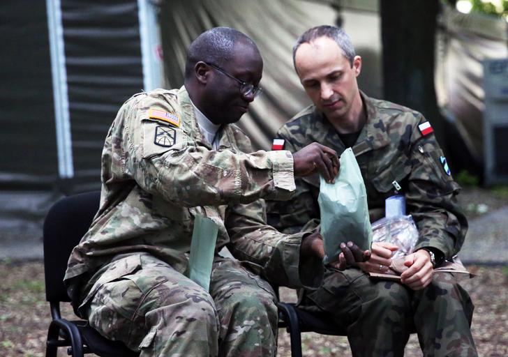 Keywords: outdoor Lt. Col. Paul Powell from the U.S. Army Europe G6 shares an MRE meal with a Polish CIS officer during Exercise Anakonda 2016 June 6 at the National Defense University in Warsaw, Poland. "This is important for relationships and for enabling the Alliance. Relationships are built over time, and this exercise is just another step in the improving of our relationships and enabling the Alliance," said Col. Jimmy L. Hall Jr., commander of 5th Signal Command (Theater) and the U.S. Army Europe chief information officer/G6. Photo Credit: Mr. William B King, 5th Signal Command (Theater) Lt. Col. Paul Powell from the U.S. Army Europe G6 shares an MRE meal with a Polish CIS officer during Exercise Anakonda 2016 June 6 at the National Defense University in Warsaw, Poland. "This is important for relationships and for enabling the Alliance. Relationships are built over time, and this exercise is just another step in the improving of our relationships and enabling the Alliance," said Col. Jimmy L. Hall Jr., commander of 5th Signal Command (Theater) and the U.S. Army Europe chief information officer/G6. Photo Credit: Mr. William B King, 5th Signal Command (Theater) |