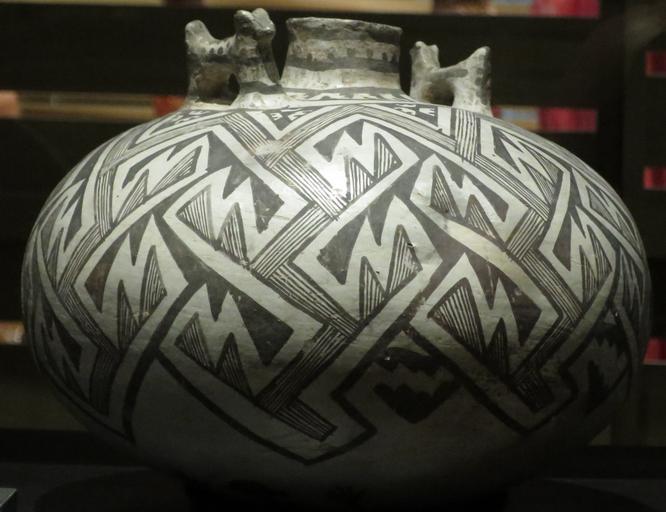 Keywords: Ancestral Pueblo, Tularosa black on white canteen, c. 1100-1250 CE, Heard Museum.JPG en Ancestral Pueblo Tularosa black on white canteen c 1100-1250 CE Heard Museum own Wmpearl photo 2015 Ancestral Pueblo pottery in the Heard Museum Native American canteens Cc-zero |