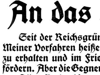 Keywords: AnDasDeutscheVolkWilhelm1914 crop.png Text der Ansprache von Kaiser Wilhelm II An das deutsche Volk vom 4 August 1914 Beim LeMO kann man sie sich http //www dhm de/lemo/html/wk1/ im Original anhören Fraktur type Detail from a poster of Kaiser Wilhelm II's address to the German people at the outbreak of the First World War 4 August 1913 AnDasDeutscheVolkWilhelm1914 jpg 2009-04-01 06 42 UTC AnDasDeutscheVolkWilhelm1914 jpg Kaizer Wilhelm II derivative work ”Michael Z <small>2009-04-01 05 43 z</small> cropped and adjusted Mzajac AnDasDeutscheVolkWilhelm1914 jpg PD-old original upload log This image is a derivative work of the following images File AnDasDeutscheVolkWilhelm1914 jpg licensed with PD-old 2008-08-07T06 57 23Z Rcbutcher 2024x2668 487918 Bytes <nowiki> Text der Ansprache von Kaiser Wilhelm II An das deutsche Volk vom 4 August 1914 Beim LeMO kann man sie sich http //www dhm de/lemo/html/wk1/ im Original a</nowiki> Uploaded with derivativeFX Fraktur |