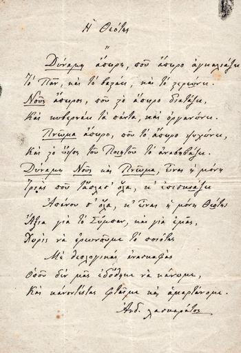 | Keywords: Andreas-laskaratos-he-theotes.jpg en Handwritten poem He Theotes by the Greek satirical poet and writer Andreas Laskaratos 1811-1901 Original page dimensions 204 x 136 mm el Χειρόγραφο οίημα «Ἡ Θεότης» του Έλληνα σατιρικού οιητή και συγγραφέα Ανδρέα Λασκαράτου 1811-1901 Διαστάσεις αρχικού φύλλου 204 x 136 mm before 1901 www vergosauctions com Andreas Laskaratos 1811-1901 other versions PD-old-70-1923 Andreas Laskaratos | ||||