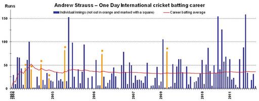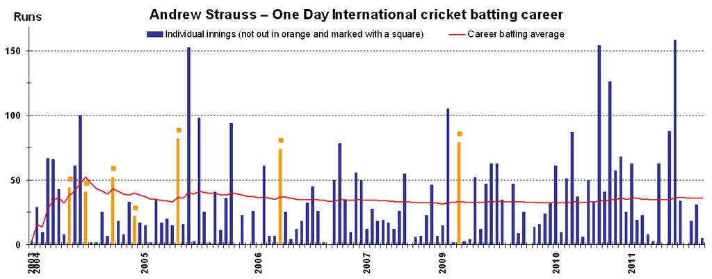 Keywords: Andrew Strauss ODI batting career v1.png This graph details the w One Day International cricket performance of English cricketer w Andrew Strauss and was created by en wiki w user EdChem Each bar indicates a single ODI game blue ones for innings in which he was dismissed orange ones marked with a square for innings in which he batted but was not out The red line shows his career batting average as at the end of each match An alternative version w File Andrew Strauss ODI batting career v2 png instead shows a 10 match moving average <p>The graph was generated with Microsoft Excel 2003 the resulting chart being copied to Adobe Photoshop 9 and saved in png format using data from w Cricinfo http //stats espncricinfo com/ci/engine/player/20387 html class 2;template results;type batting;view innings and w Howstat http //www howstat com au/cricket/Statistics/Players/PlayerProgressBat_ODI asp PlayerID 3148 This version is current as at 23 January 2012 which is also the date it was prepared; it was uploaded the following day This graph details the w One Day International cricket performance of English cricketer w Andrew Strauss and was created by en wiki w user EdChem Each bar indicates a single ODI game blue ones for innings in which he was dismissed orange ones marked with a square for innings in which he batted but was not out The red line shows his career batting average as at the end of each match An alternative version w File Andrew Strauss ODI batting career v2 png instead shows a 10 match moving average <p>The graph was generated with Microsoft Excel 2003 the resulting chart being copied to Adobe Photoshop 9 and saved in png format using data from w Cricinfo http //stats espncricinfo com/ci/engine/player/20387 html class 2;template results;type batting;view innings and w Howstat http //www howstat com au/cricket/Statistics/Players/PlayerProgressBat_ODI asp PlayerID 3148 This version is current as at 23 January 2012 which is also the date it was prepared; it was uploaded the following day 24 January 2012 own EdChem talk Uploads other versions EdChem wikipedia en Cc-zero Original upload log page en wikipedia Andrew+Strauss+ODI+batting+career+v1 png wikitable - 2012-01-24 00 27 43 1339× 524× EdChem This graph details the One Day International cricket performance of English cricketer Andrew Strauss and was created by en wiki user EdChem Each bar indicates a single ODI game blue ones for innings in which he was dismissed orange ones ma - Uncategorized 2016 July 24 |