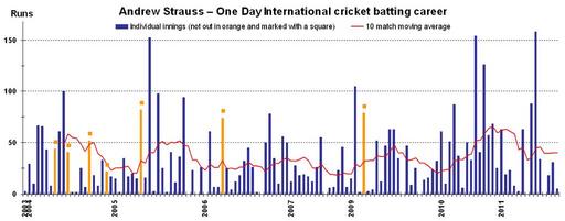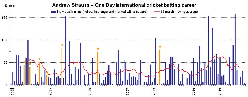 Keywords: Andrew Strauss ODI batting career v2.png This graph details the w One Day International cricket performance of English cricketer w Andrew Strauss and was created by en wiki w user EdChem Each bar indicates a single ODI game blue ones for innings in which he was dismissed orange ones marked with a square for innings in which he batted but was not out The red line shows his 10 match moving average as at the end of each match An alternative version w File Andrew Strauss ODI batting career v1 png instead shows his career batting average <p>The graph was generated with Microsoft Excel 2003 the resulting chart being copied to Adobe Photoshop 9 and saved in png format using data from w Cricinfo http //stats espncricinfo com/ci/engine/player/20387 html class 2;template results;type batting;view innings and w Howstat http //www howstat com au/cricket/Statistics/Players/PlayerProgressBat_ODI asp PlayerID 3148 This version is current as at 23 January 2012 which is also the date it was prepared; it was uploaded the following day This graph details the w One Day International cricket performance of English cricketer w Andrew Strauss and was created by en wiki w user EdChem Each bar indicates a single ODI game blue ones for innings in which he was dismissed orange ones marked with a square for innings in which he batted but was not out The red line shows his 10 match moving average as at the end of each match An alternative version w File Andrew Strauss ODI batting career v1 png instead shows his career batting average <p>The graph was generated with Microsoft Excel 2003 the resulting chart being copied to Adobe Photoshop 9 and saved in png format using data from w Cricinfo http //stats espncricinfo com/ci/engine/player/20387 html class 2;template results;type batting;view innings and w Howstat http //www howstat com au/cricket/Statistics/Players/PlayerProgressBat_ODI asp PlayerID 3148 This version is current as at 23 January 2012 which is also the date it was prepared; it was uploaded the following day 24 January 2012 own EdChem talk Uploads other versions EdChem wikipedia en Cc-zero Original upload log page en wikipedia Andrew+Strauss+ODI+batting+career+v2 png wikitable - 2012-01-24 00 29 36 1340× 525× EdChem This graph details the One Day International cricket performance of English cricketer Andrew Strauss and was created by en wiki user EdChem Each bar indicates a single ODI game blue ones for innings in which he was dismissed orange ones ma - Uncategorized 2016 July 24 |