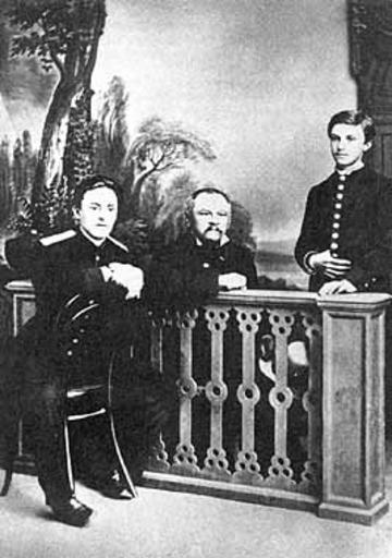 Keywords: Andrey Dostoyevsky with sons.jpg Andrey Dostoyevsky with sons Alexander left and Andrey http //emsu ru/um/excurs/Yaroslavl/Y-3 htm author date c 19 century PD-Art Black and white photographs of families Andrey Dostoyevsky
