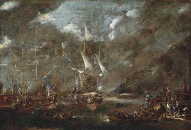 Keywords: Andries van Eertvelt - The Holy League's fleet lying off a harbour, thought to be Genoa, before the battle of Lepanto.jpg Artwork Creator Andries van Eertvelt The Holy League's fleet lying off a harbour thought to be Genoa before the battle of Lepanto with figures loading arms and armour onto a boat in the foreground with a dignitary looking on Oil on canvas cm 95 3 139 7 http //www mutualart com/Artwork/The-Holy-League-s-fleet-lying-off-a-harb/AD3A1917261C4389 /69643A353737382C73656C65637465643A74727565 mutualart com object history credit line accession number Christie's online 5835026 5786 4 Amsterdam 12 November 2014 page no more available PD-old-100 DEFAULTSORT Eertvelt Andries van; Battle of Lepanto; Christie's 2014 Marine paintings by Andries van Eertvelt Baroque paintings of ships Paintings of Battle of Lepanto Oil paintings of watercraft 17th-century sailing ships in paintings |