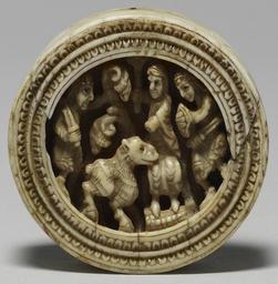 Keywords: Anglo-Norman - Game Piece with Enthroned Figure - Walters 71141.jpg On this richly carved game piece two soldiers shown with swords and shields present a sheep to an enthroned figure with a scepter in his hands The dark stone inlay used for the figures' eyes and the deep fine carving indicate costly workmanship The upper portion of the border is a modern restoration ca 1150 Medieval walrus ivory jet inlay cm 5 45 1 55 accession number 71 141 34963 Sigismund Bardac Paris date and mode of acquisition unknown Julius Boehler Munich date and mode of acquisition unknown Kaiser Friedrich Museum Berlin date and mode of acquisition unknown Henry Walters city Baltimore Walters Art Museum Henry Walters Acquired by Henry Walters 1926 Checkmate Medieval People at Play The Walters Art Museum Baltimore 2010 place of origin north France Walters Art Museum license Medieval ivory in the Walters Art Museum Round sculpted ivory items Gaming pieces Sculptures of sheep Sculptures of soldiers 12th-century sculptures Anglo-Normans |