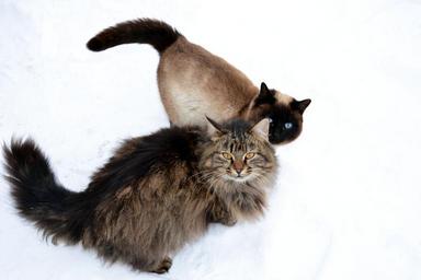 Keywords: animal furry siberian cat siamese cat blue eyes friends snow white background spring march watch walk yellow eyes tim and manya