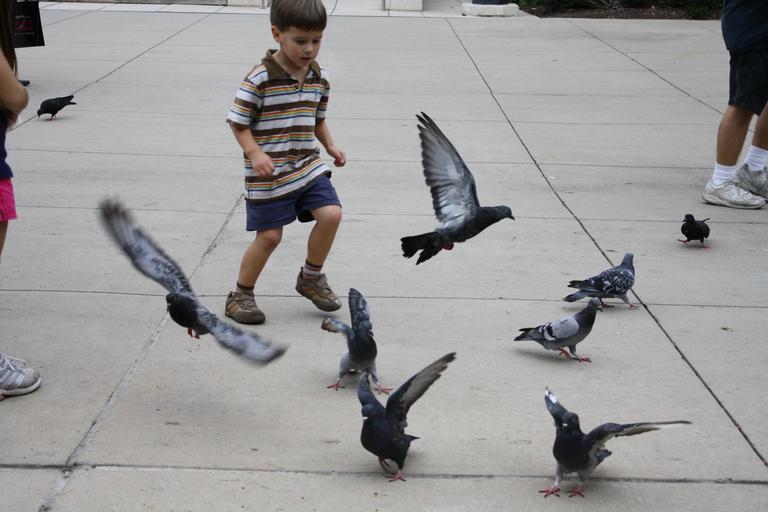 Keywords: animals child play kid birds pigeons playing beak running flying