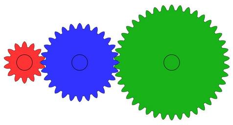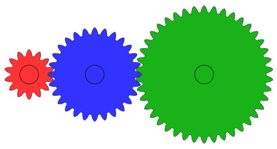 Keywords: Animated 3 Gear Row Frame1.svg en Three gears z<sub>1</sub> 14 red ; z<sub>2</sub> 28 blue ; z<sub>3</sub> 42 green de Drei Zahnrädern z<sub>1</sub> 14 rot ; z<sub>2</sub> 28 blau ; z<sub>3</Sub> 42 grün <br /> Antrieb links Abtrieb rechts<br /> i<sub>Stufe1</sub> z<sub>2</sub> / z<sub>1</sub> 28 / 14 2<br /> i<sub>Stufe2</sub> z<sub>3</sub> / z<sub>2</sub> 42 / 28 1 5<br /> i<sub>Ges</sub> i<sub>Stufe1</sub> · i<sub>Stufe2</sub> z<sub>2</sub> · z<sub>3</sub> / z<sub>1</sub> · z<sub>2</sub> z<sub>3</sub> / z<sub>1</sub> 42 / 14 3 2016-12-11 own Jahobr other versions <gallery caption> File Animated 3 Gear Row gif animated GIF version </gallery> cc-zero Jahobr v fl Code is given in the animated version File Animated 3 Gear Row gif Drawings of gears and gearboxes Blue green red |
