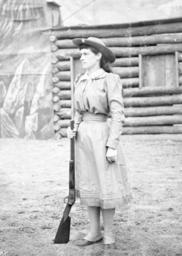 Keywords: Annie Oakley by Stacy, 1894.jpg Phoebe Anne Annie Oakley Moses poses in the center foreground in a dirt arena for Buffalo Bill's Wild West Show at Ambrose Park in Brooklyn New York Annie Oakley who was one of the major attractions to the show wears a dress and a cowboy hat with a star hanging from its brim She holds a rifle propped on its end with her left hand A log cabin is in the background http //digital denverlibrary org/cdm/singleitem/collection/p15330coll22/id/79350/rec/11 Denver Public Library 1894 Stacy 5th Ave and 7th Brooklyn N Y PD-old Annie Oakley 1894 photographs |