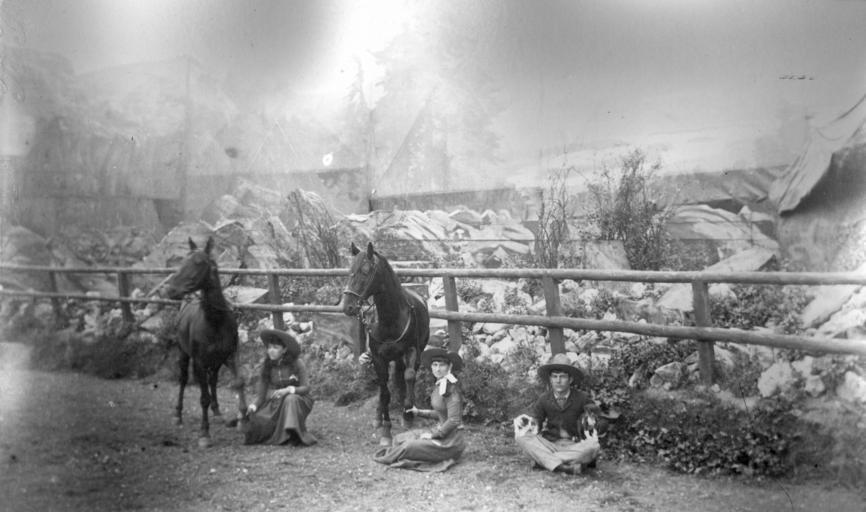 Keywords: Annie Oakley with horse c1889.jpg Annie Oakley center sits on the ground holding the front hoof of a horse in front of a set for Buffalo Bill's Wild West Show Another young woman possibly Della Ferrell sits near her also in front of a horse A young man sits on the ground in the right foreground holding a cat in his right hand and a puppy in his left hand A wood rail fence stands behind the small group http //digital denverlibrary org/cdm/singleitem/collection/p15330coll22/id/79201/rec/18 Denver Public Library ~ 1889 unattributed PD-old Annie Oakley |