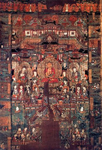 Keywords: Anonymous-Baoen Sutra Paradise2.jpg Mogao Caves near Dun Huang in the 1000 Buddha cave Shakyamuni is seated in the center of the image The left and right sides show seen of Prince Siddhartha as described in the Baoen Sutra Located at the British Museum Department of Asia 莫高窟 釋迦牟尼 中 大英博物館 Zhongguo gu dai shu hua jian ding zu 中国古代书画鑑定组 1997 Zhongguo hui hua quan ji 中国绘画全集 Zhongguo mei shu fen lei quan ji Beijing Wen wu chu ban she Volume 1 Creator Anonymous Museum British Museum credit line Tang Dynasty ca 850 PD-Art Gautama Buddha Buddhist paintings of the Tang Dynasty Mogao Cave paintings Art of ancient China in the British Museum |
