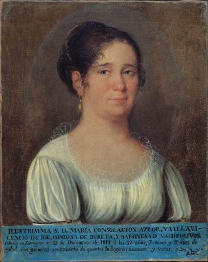 Keywords: Anonymous Spanish Painter - María Consolación Azlor, Countess of Bureta - Google Art Project.jpg 1700 Spain 1700 1800 Spain 1800 None 407237 Spanish 1700 - 1800 /collection/fundacion-banco-santander/artwork/maria-consolacion-azlor-countess-of-bureta-anonymous-spanish-painter/416109/ Anonymous Spanish Painter Painter /artist/spanish-painter/4127100/ 4127100 /collection/fundacion-banco-santander/ Fundación Banco Santander 351009 http //www fundacionbancosantander com/ 11/25/2011 11 04 09 AM /collection/fundacion-banco-santander/artwork/maria-consolacion-azlor-countess-of-bureta-anonymous-spanish-painter/416109/ 1820 1820 Oil on canvas 510 416109 False 1820 Complete 3/24/2012 1 00 25 AM 32 http //www fundacionbancosantander com/coleccion/ /obra/32 http //www fundacionbancosantander com/ Fundación Banco Santander Fundación Banco Santander Painting 1820 1830 City Madrid Spain Exhibition w420 x h510 mm 1820 False 0 794921875 www fundacionbancosantander com Object maria-consolacion-azlor-countess-of-bureta-anonymous-spanish-painter María Consolación Azlor Countess of Bureta m 420 Inscribed on the painted cartouche running along the lower edge ILUSTRÍSIMA S D MARÍA CONSOLACLÓN AZLOR Y VILLAVICENCIO DE RIC CONDESA DE BURETA Y BARONESA DE VALDEOLIVOS Falleció en Zaragoza el 28 de diciembre de 1814 a los 39 años 7 meses y 12 días de edad con general sentimiento de quantos la Ilegaron a conocer y tratar Oil on canvas special url_id cQEIRky7t9Fg7g PD-old-100-1923 1800 Google Art Project works by unknown artist Spain Paintings of women 1820 paintings |
