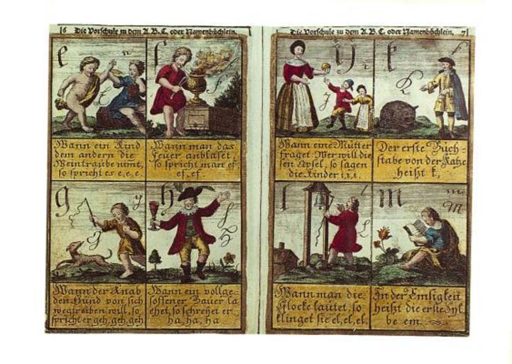 Keywords: Antesperg ABC.jpg en The ABC-booklet by Johann Balthasar Antesperg from Lower Bavaria written in the Upper German literature language for the young Joseph II later emperor of the Holy Roman Empire 1741 de Das Josephinische Erzherzögliche A B C Oder Nambenbüchlein von Johann Balthasar Antesperg aus Niederbayern geschrieben in der Oberdeutschen Schreibsprache für den jungen Joseph II den späteren Kaiser des Heiligen Römischen Reiches 1741 <br> Text not written in today's standard German <br> E - Wann ein Kind dem andern die Weintraube nimt so spricht es e e e <br> F - Wann man das Feüer anblaset so spricht man ef ef ef <br> G - Wann der Knab den Hund von sich wegtreiben will so spricht er geh geh geh <br> H - Wann ein vollgesoffener Bauer lachet so schreÿet er ha ha ha <br> IJ- Wann eine Mutter fraget Wer will diesen Apfel so sagen die Kinder i i i <br> K - Der erste Buchstabe von der Katze heißt k <br> L - Wann man die Glocke laütet so klinget sie el el el <br> M - In der Emsigkeit heißt die erste Sylbe em <br> AEIOU Österreich-Lexikon 1739 Johann Balthasar von Antesperg en 2-dimensional facsimile of a picture whose author died more than 100 years ago de Werden zweidimensionale Vorlagen Gemälde Fotos Zeichnungen Kupferstiche Radierungen Holzschnitte lediglich reproduziert sind die dadurch entstandenen Aufnahmen nach herrschender Meinung nicht urheberrechtlich geschützt PD-old-100 Alphabet books |