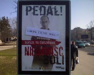 Keywords: AntiHomoPL.jpg pl Polska Zwandalizowany plakat przeciw mowie nienawiści wobec osób homoseksualnych en Poland Anti-discrimination poster remade by the someone The text on the poster says Faggot I hear it everyday Hate hurts Someone placed piece of white paper in the middle which says Your ass doesn't hurt you My photo camera ArPol Photo has been uploaded on Polish site called wrzuta pl by me two years ago Homophobia in Poland |