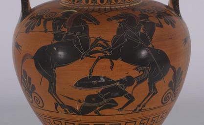| Keywords: Antimenes Painter - Black-figure Amphora with Ajax Carrying the Dead Achilles - Walters 4817 - Detail B.jpg The death of Achilles which occurred after the events recounted in The Iliad was described in another epic poem called The Aethiopis which has not survived On the front of this amphora the dead Achilles is carried from the Trojan battlefield by his comrade Ajax In front of Ajax a woman leads the way and raises her hand to tear at her hair in a gesture of mourning Two armed warriors follow behind On the back two armed horsemen clash on the battlefield their horses rearing above a fallen warrior trapped beneath them between 530 520 BC Archaic terracotta cm 38 1 27 9 accession number 48 17 18168 Don Marcello Massarenti Collection Rome before 1897 no 183 Henry Walters city Baltimore Walters Art Museum Henry Walters Acquired by Henry Walters with the Massarenti Collection 1902 Image and Word The Mitchell Gallery Annapolis 1989 Heroes Mortals and Myths in Ancient Greece The Walters Art Museum Baltimore; Frist Center for the Visual Arts Nashville; San Diego Museum Of Art San Diego; Alexander S Onassis Public Benefit Foundation USA New York 2009-2011 place of origin Attica Greece Walters Art Museum license Riders in ancient Greek pottery Antimenes Painter Ancient Greek Neck amphoras Ancient Greek black-figure pottery in the Walters Art Museum 530s BC pottery 520s BC pottery Media contributed by the Walters Art Museum needs artist update |