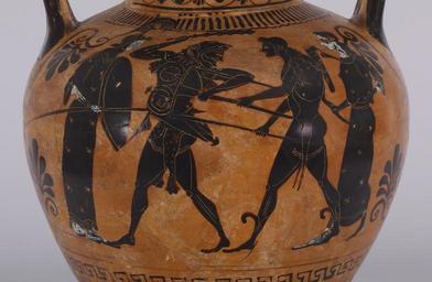 | Keywords: Antimenes Painter - Black-figure Amphora with Herakles and Apollo Fighting Over the Tripod - Walters 4821 - Detail A.jpg This amphora pairs a scene of Dionysus with one of Herakles' exploits the struggle between Herakles and Apollo for the Delphic tripod According to myth Herakles traveled to the sanctuary of Apollo at Delphi to consult the oracle but when no answer was forthcoming the hero seized Apollo's tripod prompting a fight between the two Herakles draped in his lion-skin and carrying a club menaces a youthful Apollo while Herakles' protector Athena and Apollo's twin sister Artemis remain on the sidelines On the back Dionysus encounters the lame Hephaestus god of fire and metalworking riding on a donkey as a maenad looks on ca 520 BC Archaic terracotta cm 41 5 28 accession number 48 21 6825 Don Marcello Massarenti Collection Rome date and mode of acquisition unknown 1897 cat no 194 Henry Walters city Baltimore Walters Art Museum Henry Walters Acquired by Henry Walters with the Massarenti Collection 1902 Heroes Mortals and Myths in Ancient Greece The Walters Art Museum Baltimore; Frist Center for the Visual Arts Nashville; San Diego Museum Of Art San Diego; Alexander S Onassis Public Benefit Foundation USA New York 2009-2011 place of origin Attica Greece Walters Art Museum license Apollo in ancient Greek pottery Artemis in ancient Greek pottery Athena in ancient Greek pottery Heracles in ancient Greek pottery Heracles and Athena Delphic tripod Tripods in ancient Greek pottery Antimenes Painter Ancient Greek Neck amphoras Ancient Greek black-figure pottery in the Walters Art Museum 520s BC pottery Media contributed by the Walters Art Museum needs artist update |