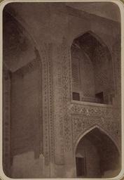 | Keywords: Antiquities of Samarkand. Inner Courtyard of the Shir Dar Madrasah (Southern Side). Inscription along the Right Side of the Main Niche WDL3606.png Artwork ru Богаевский иколай Владими ович 1843 1912 гг fr Bogaevskii Nikolaï V 1843-1912 en Bogaevskii Nikolai V 1843-1912 zh 亚历山大·L· ,1840-1888 年 pt Bogaevskii Nikolai V 1843-1912 ar بوغافسكي، نيكولاي ف ، 1843-1912 es Bogaevskii Nikolai V 1843-1912 ru Сама кандские д евности Внут енний дво мед есе Ши -До южная сто она адпись по п авую сто ону главной ниши fr Antiquités de Samarcande Cour intérieure de la madrasa de Shir Dar côté sud Inscription le long du côté droit de la niche principale en Antiquities of Samarkand Inner Courtyard of the Shir Dar Madrasah Southern Side Inscription along the Right Side of the Main Niche zh 撒马尔罕古迹 尔·达伊斯兰教学校内部庭院(南侧) 主壁龛右侧铭文 pt Antiguidades de Samarcanda Pátio interno da madrassa de Shir Dar lado sul Inscrição no lado direito do nicho principal ar آثار سمرقند فناء داخلي من مدرسة شير دار الجهة الجنوبية نقش بطول اللوحة اليمنى للمِشْكاة الرئيسية ru Эта фотог афия внут еннего дво а мед есе Ши -До в Сама канде Узбекистан соде жится в а хеологической части <em> Ту кестанского альбома </em> Шеститомное фотог афическое исследование было п оведено в 1871 1872 гг под уководством гене ала Константина П фон Кауфмана пе вого гене ал-губе нато а 1867 1882 гг Ту кестана как называли те ито ию Цент альной Азии п инадлежавшую Российской импе ии В альбоме уделяется особое внимание исламской а хитекту е Сама канда в том числе памятникам XIV и XV вв пе иода п авления Тиму а Таме лана и его п еемников В цент е Сама канда находится ансамбль Регистан объединяющий в себе т и основных об азца <em>мед есе</em> елигиозных школ Вто ое мед есе в ансамбле Ши -До было пост оено в 1619 1636 гг во в емена династии Ашта ханидов есмот я на значительные пов еждения нанесенные мед есе в течение многих веков оно остается одним из самых богато ук ашенных памятников в Цент альной Азии Фо ма этого мед есе является типичной для егиона п ямоугольный дво ок уженный двухэтажной а кадой кото ая соде жит комнаты для ученых Здесь изоб ажена ниша <em>айван</em> сводчатый зал с одним отк ытым концом ок уженный с т ех сто он стенами находящаяся в цент е южной стены вместе с одним п яслом а кады сп ава Пове хности пок ыты многоцветной плиткой майоликой создающей сложные геомет ические и ботанические узо ы ад две ью вто ого этажа асположено ешетчатое вентиляционное окно Айван об амлен ве тикальной полосой с надписью выполненной в укописном стиле <br>А хитекту ные ук ашения и деко ативные элементы; адписи; Исламская а хитекту а; ед есе; иши; Фотог афические исследования fr Cette photographie de l'intérieur de la cour de la madrasa de Shir Dar à Samarcande Ouzbékistan est extraite de l'ouvrage archéologique <em>Album du Turkestan</em> Cet inventaire photographique en six volumes fut réalisé entre 1871 et 1872 sous le patronage du général Konstantin P von Kaufman premier gouverneur général 1867-1882 du Turkestan nom donné aux territoires d'Asie centrale de l'Empire russe L'album consacre une attention particulière à l'architecture islamique de Samarcande avec notamment des monuments datant des XIV<sup>e</sup> et XV<sup>e</sup> siècles lors du règne de Tamerlan et de ses successeurs Situé au centre de Samarcande l'ensemble du Registan est composé de trois exemples majeurs de <em>madrasa</em> école religieuse La seconde madrasa de l'ensemble celle de Shir Dar fut construite entre 1619 et 1636 au cours de la dynastie astrakane Malgré les dommages considérables subis au cours des siècles elle demeure l'un des monuments les plus luxueusement décorés d'Asie centrale Typique de la région cette madrasa est formée d'une cour rectangulaire entourée d'une arcade à deux étages qui contient des salles réservées aux érudits On peut voir ici la niche de l'<em>aivan</em> salle voûtée dotée de trois murs et d'un côté ouvert au centre du mur sud avec une saillie de l'arcade à droite Les surfaces sont recouvertes de carreaux de majolique polychromes formant des motifs géométriques et à fleurs sophistiqués Au-dessus de la porte au second étage se trouvent les croisillons de la fenêtre de ventilation Une bande d'inscription verticale d'un style cursif encadre l'aivan <br>Décorations et ornements architecturaux; Inscriptions; Architecture islamique; Madrasas; Niches; Inventaires photographiques en This photograph of the int