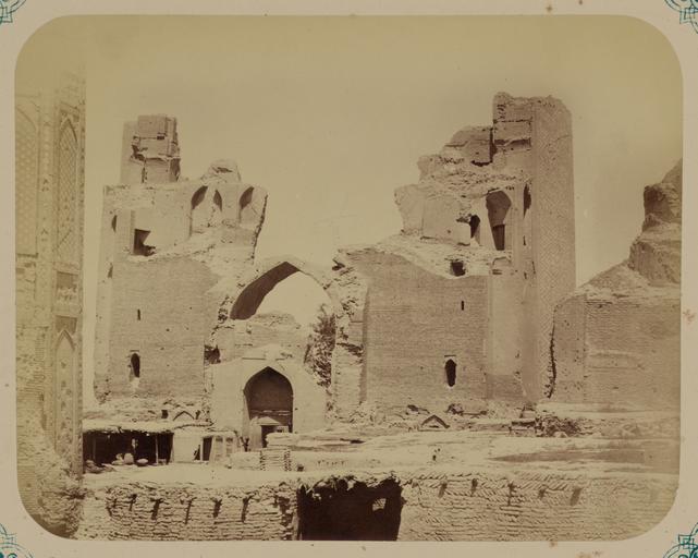 | Keywords: Antiquities of Samarkand. Madrasah of Bibi Khanym. View of the Main Entry from the Interior WDL3771.png Artwork ru Богаевский иколай Владими ович 1843 1912 гг fr Bogaevskii Nikolaï V 1843-1912 en Bogaevskii Nikolai V 1843-1912 zh 亚历山大·L· ,1840-1888 年 pt Bogaevskii Nikolai V 1843-1912 ar بوغافسكي، نيكولاي ف ، 1843-1912 es Bogaevskii Nikolai V 1843-1912 ru Сама кандские д евности ед есе Биби Ханым Вид главного входа с внут енней сто оны fr Antiquités de Samarcande Madrasa de Bibi Khanym Vue de l'entrée principale depuis l'intérieur en Antiquities of Samarkand Madrasah of Bibi Khanym View of the Main Entry from the Interior zh 撒马尔罕古迹 比比·哈努姆伊斯兰教学校 从内部 到的主入口景观 pt Antiguidades de Samarcanda Madrassa de Bibi Khanym Imagem interna da entrada principal ar آثار سمرقند مدرسة بيبي خانوم منظر للمدخل الرئيسي من الداخل ru Эта фотог афия азвалин ст оения на входе в ансамбль Биби Ханым в Сама канде Узбекистан соде жится в а хеологической части <em> Ту кестанского альбома </em> Шеститомное фотог афическое исследование было подготовлено и издано в 1871 1872 гг под пат онажем гене ала Константина П фон Кауфмана пе вого гене ал-губе нато а 1867 1882 гг Ту кестана как называли в то в емя те ито ию Цент альной Азии п инадлежавшую Российской импе ии В альбоме уделяется особое внимание исламской а хитекту е Сама канда в том числе памятникам XIV и XV вв пе иода п авления Тиму а Таме лана и его п еемников Пост оенный в 1399 1405 гг за счет т офеев добытых в победоносной индийской кампании Тиму а ансамбль Биби Ханым был местом асположения главной мечети го ода названной в честь ста шей жены Тиму а Са ай ульк Ханым <em>bibi</em> означает леди или мать Ансамбль должен был стать одной из к упнейших мечетей исламского ми а и включал в себя не только главную мечеть угол кото ой виден на снимке с левого к ая но и г андиозное ст оение служившее входом в главный дво из кото ого сделан снимок Ансамбль се ьезно ст адал от землет ясений на п отяжении многих веков но на этом снимке до сих по видна монументальная входная а ка а также ог омные остовы азвалин боковых башен а пе еднем плане показаны плоские к ыши глинобитных ст оений база а в п еделах кото ого находится небольшая тоже пов ежденная мечеть <br>А хеологические объекты; Исламская а хитекту а; ед есе; Фотог афические исследования fr Cette photographie des ruines de la structure d'entrée de Bibi Khanym à Samarcande Ouzbékistan est extraite de l'ouvrage archéologique <em>Album du Turkestan</em> Cet inventaire photographique en six volumes fut réalisé entre 1871 et 1872 sous le patronage du général Konstantin P von Kaufman premier gouverneur général 1867-1882 du Turkestan nom donné aux territoires d'Asie centrale de l'Empire russe L'album consacre une attention particulière à l'architecture islamique de Samarcande avec notamment des monuments datant des XIV<sup>e</sup> et XV<sup>e</sup> siècles lors du règne de Tamerlan et de ses successeurs Construit entre 1399 et 1405 avec le butin de la campagne victorieuse de Tamerlan en Inde l'ensemble de Bibi Khanym fut désigné comme la mosquée principale de la ville et nommé en hommage à la première épouse de Tamerlan Sarai Mulk Khanym <em>bibi</em> signifiant « dame » ou « mère » Conçu pour être l'une des plus grandes mosquées du monde islamique l'ensemble comportait non seulement la mosquée principale dont un angle est visible complètement à gauche mais également une grande structure qui servait d'entrée vers la cour majeure de laquelle cette vue fut prise Bien que l'ensemble ait subi des dommages considérables dus à l'activité sismique au fil des siècles l'arceau d'entrée monumental existe encore tout comme les tours gigantesques en ruines qui l'encadrent Les toits plats des bâtiments en briques de terre crue d'un bazar contenant une petite mosquée également endommagée sont visibles au premier plan <br>Sites archéologiques; Architecture islamique; Madrasas; Inventaires photographiques en This photograph of the ruins of the Bibi Khanym entrance structure in Samarkand Uzbekistan is from the archeological part of <em>Turkestan Album</em> The six-volume photographic survey was produced in 1871-72 under the patronage of General Konstantin P von Kaufman the first governor-general 1867-82 of Turkestan as the Russian Empire's Central Asian territories were called The album devotes special attention to Samarkand s Islamic architecture such as 14th- and 15th-century monuments from the reign of Timur Tamerlane and his successors Built in 1399-1405 with the spoils of Timur s victorious campaign in India the Bibi Khanym ensemble was d