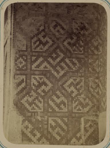 | Keywords: Antiquities of Samarkand. Madrasah of Nadir Divan-Begi. Inscriptions Around the Inner Main Niche in Front of the Door from Outside WDL3776.png Artwork ru Богаевский иколай Владими ович 1843 1912 гг fr Bogaevskii Nikolaï V 1843-1912 en Bogaevskii Nikolai V 1843-1912 zh 亚历山大·L· ,1840-1888 年 pt Bogaevskii Nikolai V 1843-1912 ar بوغافسكي، نيكولاي ف ، 1843-1912 es Bogaevskii Nikolai V 1843-1912 ru Сама кандские д евности ед есе ади Диван-Беги адписи идущие внут и главной ниши п и входе с улицы fr Antiquités de Samarcande Madrasa de Nadir Divan-Begi Inscriptions autour de la principale niche intérieure face à la porte depuis l'extérieur en Antiquities of Samarkand Madrasah of Nadir Divan-Begi Inscriptions Around the Inner Main Niche in Front of the Door from Outside zh 撒马尔罕古迹 纳迪尔·迪万- 吉伊斯兰教学校 外侧大门前 内部主壁龛四周的铭文 pt Antiguidades de Samarcanda Madrassa de Nadir Divan-Begi Inscrições em torno do nicho principal interno em frente à porta vista desde fora ar آثار سمرقند مدرسة نذير ديفان بيغي نقوش حول المِشْكاة الداخلية الرئيسية أمام الباب من الخارج ru Эта фотог афия мед есе ади Диван-Беги в Сама канде Узбекистан соде жится в а хеологической части <em> Ту кестанского альбома </em> Шеститомное фотог афическое исследование было подготовлено и издано в 1871 1872 гг под пат онажем гене ала Константина П фон Кауфмана пе вого гене ал-губе нато а 1867 1882 гг Ту кестана как называли в то в емя те ито ию Цент альной Азии п инадлежавшую Российской импе ии В альбоме уделяется особое внимание исламскому а хитекту ному наследию Сама канда Эта <em>мед есе</em> елигиозная школа асположенная ядом с усыпальницей Ходжа Ах а была пост оена в 1631 г ади ом Диван-Беги визи ем и дядей буха ского п авителя Имам-Кули Хана ед есе в плане выглядела как п ямоугольный дво с п илегающей одноэтажной к ытой гале еей для ученых и мечетью с одной сто оны а фотог афии видна ве хняя п авая часть ниши об азованной главной а кой <em>айвана</em> сводчатого зала с одним отк ытым концом ок уженного с т ех сто он стенами выходящей на улицу Пове хность стены пок ыта ке амической плиткой искусные геомет ические узо ы из кото ой соде жат куфические буквы об азующие слова из калимы основы шахады или исламской декла ации ве ы Основными цветами плитки являются синий и голубой с элементами белого желтого и о анжевого цветов а задней стене ниши с т удом азличимой сп ава п одолжается о намент отделки к ыла С левого к ая находится внешняя пове хность фасада айвана ук ашенная фаянсовыми панелями <br>А хитекту ные ук ашения и деко ативные элементы; адписи; Исламская а хитекту а; ед есе; Фотог афические исследования fr Cette photographie de la mosquée de Madrasa de Nadir Divan-Begi à Samarcande Ouzbékistan est extraite de l'ouvrage archéologique <em>Album du Turkestan</em> Cet inventaire photographique en six volumes fut réalisé entre 1871 et 1872 sous le patronage du général Konstantin P von Kaufman premier gouverneur général 1867-1882 du Turkestan nom donné aux territoires d'Asie centrale de l'Empire russe L'album consacre une attention particulière à l'héritage de l'architecture islamique de Samarcande Jouxtant le sanctuaire de Khodzha Akhrar cette <em>madrasa</em> école religieuse fut achevée en 1631 sous Nadir Divan-Begi vizir et oncle du souverain de Boukhara Imam-Quli Khan Elle fut conçue comme une cour rectangulaire entourée d'un cloître à un étage pour les érudits avec une mosquée à une extrémité Cette vue présente la partie centrale du flanc gauche de la niche formée par l'arceau principal de l'<em>aivan </em> salle voûtée dotée de trois murs et d'un côté ouvert face à la rue La surface du mur est composée de carreaux de céramique dont les motifs géométriques sophistiqués incluent des lettres kufiques angulaires formant des mots de la kalima fondement de la chahada et profession de foi islamique Les couleurs de base des carreaux sont le bleu foncé et le bleu clair avec des détails en blanc jaune et orange Le mur du fond de la niche est à peine visible sur la droite mais il arbore les mêmes motifs ornementaux que le flanc Complètement à gauche la surface extérieure de la façade de l'aivan est décorée de panneaux de lambris recouverts de faïence <br>Décorations et ornements architecturaux; Inscriptions; Architecture islamique; Madrasas; Inventaires photographiques en This photograph of the Nadir Divan-Begi Madrasah in Samarkand Uzbekistan is from the archeological part of <em>Turkestan Album</em> The six-volume ph