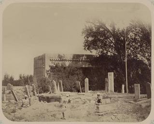 | Keywords: Antiquities of Samarkand. Mosque of Khodzha Akhrar. General View of the Crypt of Saint Khodzha Akhrar and the Mosque WDL3743.png Artwork ru Богаевский иколай Владими ович 1843 1912 гг fr Bogaevskii Nikolaï V 1843-1912 en Bogaevskii Nikolai V 1843-1912 zh 亚历山大·L· ,1840-1888 年 pt Bogaevskii Nikolai V 1843-1912 ar بوغافسكي، نيكولاي ف ، 1843-1912 es Bogaevskii Nikolai V 1843-1912 ru Сама кандские д евности ечеть Ходжа Ах а Общий вид кладбища святого Ходжа Ах а а и мечети fr Antiquités de Samarcande Mosquée de Khodzha Akhrar Vue d'ensemble de la crypte de saint Khodzha Akhrar et de la mosquée en Antiquities of Samarkand Mosque of Khodzha Akhrar General View of the Crypt of Saint Khodzha Akhrar and the Mosque zh 撒马尔罕古迹 贾·阿赫拉尔清 寺 贾·阿赫拉尔墓室及清 寺全景 pt Antiguidades de Samarcanda Mesquita de Khodzha Akhrar Vista geral da cripta do Santo Khodzha Akhrar e da mesquita ar آثار سمرقند مسجد خواجه أحرار منظر عام للسرداب الخاص بالوليّ خواجه أحرار والمسجد ru Эта фотог афия усыпальницы Ходжа Ах а в Сама канде Узбекистан соде жится в а хеологической части <em> Ту кестанского альбома </em> Шеститомное фотог афическое исследование было подготовлено и издано в 1871 1872 гг под пат онажем гене ала Константина П фон Кауфмана пе вого гене ал-губе нато а 1867 1882 гг Ту кестана как называли в то в емя те ито ию Цент альной Азии п инадлежавшую Российской импе ии В альбоме уделяется особое внимание исламскому а хитекту ному наследию Сама канда К усыпальнице относится несколько ст оений посвященных памяти известного мистика XV века Ходжа Ах а а 1403 1489 гг Основными элементами являются зимняя и летняя мечети Летняя мечеть кото ую видно на заднем фоне была пост оена из саманного ки пича Ее по тик <em>айвана</em> сводчатый зал с одним отк ытым концом ок уженный с т ех сто он стенами подде живаемый де евянными колоннами на м амо ных основаниях увенчан ка низом со сложной езьбой включающей сталактитовый узо Ансамбль также включал бассейн и кладбище для выдающихся елигиозных лиде ов а этой фотог афии кладбища видны м амо ные са кофаги и надг обные камни с деко ативной езьбой и надписями Хотя могилы находятся в некото ом беспо ядке кладбище сох аняет свое значение как место паломничества и молитвы Сидящая фигу а сп ава поглощена чтением ве оятнее всего текста елигиозного соде жания Его длинная бо ода и белый тю бан позволяют п едположить что это мулла <br>Кладбища; ечети; Фотог афические исследования; огильные памятники; Г обницы fr Cette photographie du sanctuaire de Khodzha Akhrar à Samarcande Ouzbékistan est extraite de l'ouvrage archéologique <em>Album du Turkestan</em> Cet inventaire photographique en six volumes fut réalisé entre 1871 et 1872 sous le patronage du général Konstantin P von Kaufman premier gouverneur général 1867-1882 du Turkestan nom donné aux territoires d'Asie centrale de l'Empire russe L'album consacre une attention particulière à l'héritage de l'architecture islamique de Samarcande Le sanctuaire contient plusieurs structures dédiées à la mémoire de Khodzha Akhrar 1403-1489 éminent mystique du XV<sup>e</sup> siècle Les principaux composants sont des mosquées d'hiver et d'été La mosquée d'été visible en arrière-plan fut construite en briques d'adobe Le portique de son <em>aivan</em> salle voûtée dotée de trois murs et d'un côté ouvert soutenu par des colonnes de bois reposant sur des bases en marbre est surplombé d'une corniche ornée de gravures complexes notamment des motifs formant des « stalactites » L'ensemble inclut également un bassin et un cimetière dédié aux éminents chefs religieux Cette vue du cimetière présente un sarcophage et des pierres tombales en marbre ornés d'inscriptions et de sculptures Malgré le désordre apparent des sépulcres le cimetière reste néanmoins un lieu de pèlerinage et de prière important La personne assise sur la droite lit vraisemblablement un texte dévotionnel Sa longue barbe et son turban blanc suggèrent un statut de mollah <br>Cimetières; Mosquées; Inventaires photographiques; Monuments funéraires; Tombes en This photograph of the Khodzha Akhrar shrine in Samarkand Uzbekistan is from the archeological part of <em>Turkestan Album</em> The six-volume photographic survey was produced in 1871-72 under the patronage of General Konstantin P von Kaufman the first governor-general 1867-82 of Turkestan as the Russian Empire s Central Asian territories were called The album devotes special attention to Samarkand s Islamic architectural heritage The shrine contains several structures dedicated to the mem