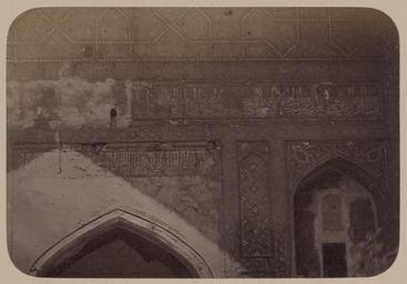 | Keywords: Antiquities of Samarkand. Shir Dar Madrasah. Inscriptions in the Main Niche of the Facade WDL3831.png Artwork ru Богаевский иколай Владими ович 1843 1912 гг fr Bogaevskii Nikolaï V 1843-1912 en Bogaevskii Nikolai V 1843-1912 zh 亚历山大·L· ,1840-1888 年 pt Bogaevskii Nikolai V 1843-1912 ar بوغافسكي، نيكولاي ف ، 1843-1912 es Bogaevskii Nikolai V 1843-1912 ru Сама кандские д евности ед есе Ши -До адписи в главной нише фасада fr Antiquités de Samarcande Madrasa de Shir Dar Inscriptions dans la niche principale de la façade en Antiquities of Samarkand Shir Dar Madrasah Inscriptions in the Main Niche of the Facade zh 撒马尔罕古迹 尔·达伊斯兰教学校 立 主壁龛中的铭文 pt Antiguidades de Samarcanda Madrassa Shir Dar Inscrições no nicho principal da fachada ar آثار سمرقند مدرسة شير دار نقوش على المِشْكاة الرئيسة للواجهة ru Эта фотог афия мед есе Ши -До в Сама канде Узбекистан соде жится в а хеологической части <em> Ту кестанского альбома </em> Шеститомное фотог афическое исследование было подготовлено и издано в 1871 1872 гг под пат онажем гене ала Константина П фон Кауфмана пе вого гене ал-губе нато а 1867 1882 гг Ту кестана как называли в то в емя те ито ию Цент альной Азии п инадлежавшую Российской импе ии В альбоме уделяется особое внимание исламской а хитекту е Сама канда в том числе памятникам XIV и XV вв пе иода п авления Тиму а Таме лана и его п еемников В цент е Сама канда находится ансамбль Регистан объединяющий в себе т и основных об азца <em>madrasah</em> мед есе елигиозных школ Вто ое мед есе в ансамбле Ши -До было пост оено в 1619 1636 гг во в емена династии Ашта ханидов Здесь показаны богатые ке амические ук ашения стены внут и <em>айвана</em> сводчатого зала с одним отк ытым концом ок уженного с т ех сто он стенами Внизу видна ст ельчатая а ка над главным входом над кото ой находится го изонтальная полоса с надписью в укописном стиле сулюс П ост анство с каждой сто оны ук ашено замысловатыми геомет ическими и ботаническими фигу ами Сп ава видна ст ельчатая ниша с окном на вто ом этаже Как и остальной фасад эта ниша пок ыта искусной ке амикой ад а ками асположена еще одна го изонтальная полоса с укописным письмом об амленная деко ативными полосами В самом ве ху видна пове хность с к упными пе есекающимися геомет ическими узо ами <br>А хитекту ные ук ашения и деко ативные элементы; адписи; Исламская а хитекту а; ед есе; Фотог афические исследования fr Cette photographie de la madrasa de Shir Dar à Samarcande Ouzbékistan est extraite de l'ouvrage archéologique <em>Album du Turkestan</em> Cet inventaire photographique en six volumes fut réalisé entre 1871 et 1872 sous le patronage du général Konstantin P von Kaufman premier gouverneur général 1867-1882 du Turkestan nom donné aux territoires d'Asie centrale de l'Empire russe L'album consacre une attention particulière à l'architecture islamique de Samarcande avec notamment des monuments datant des XIV<sup>e</sup> et XV<sup>e</sup> siècles lors du règne de Tamerlan et de ses successeurs Situé au centre de Samarcande l'ensemble du Registan est composé de trois exemples majeurs de <em>madrasa</em> école religieuse La madrasa de Shir Dar seconde de l'ensemble fut construite entre 1619 et 1636 au cours de la dynastie astrakane Cette vue présente le riche ornement en céramique du mur à l'intérieur de l'<em>aivan</em> salle voûtée dotée de trois murs et d'un côté ouvert Dans la partie inférieure l'arceau pointu de l'entrée principale est visible avec au-dessus une bande d'inscription horizontale en style cursif thoulouth De chaque côté les espaces sont décorés de figures géométriques et à fleurs sophistiquées Sur la droite une niche pointue laisse apparaître une fenêtre au second étage Comme le reste de la façade la surface de cette niche est recouverte de céramiques complexes Au-dessus des arceaux une autre bande horizontale d'écriture cursive est bordée d'un cadre ornemental La surface de la partie supérieure de la vue est composée de grands motifs géométriques s'entrecroisant <br>Décorations et ornements architecturaux; Inscriptions; Architecture islamique; Madrasas; Inventaires photographiques en This photograph of the Shir Dar Madrasah in Samarkand Uzbekistan is from the archeological part of <em>Turkestan Album</em> The six-volume photographic survey was produced in 1871-72 under the patronage of General Konstantin P von Kaufman the first governor-general 1867-82 of Turkestan as the Russian Empire s Central Asian territories were called The album devotes special attention to Samarkand s Islamic architecture 